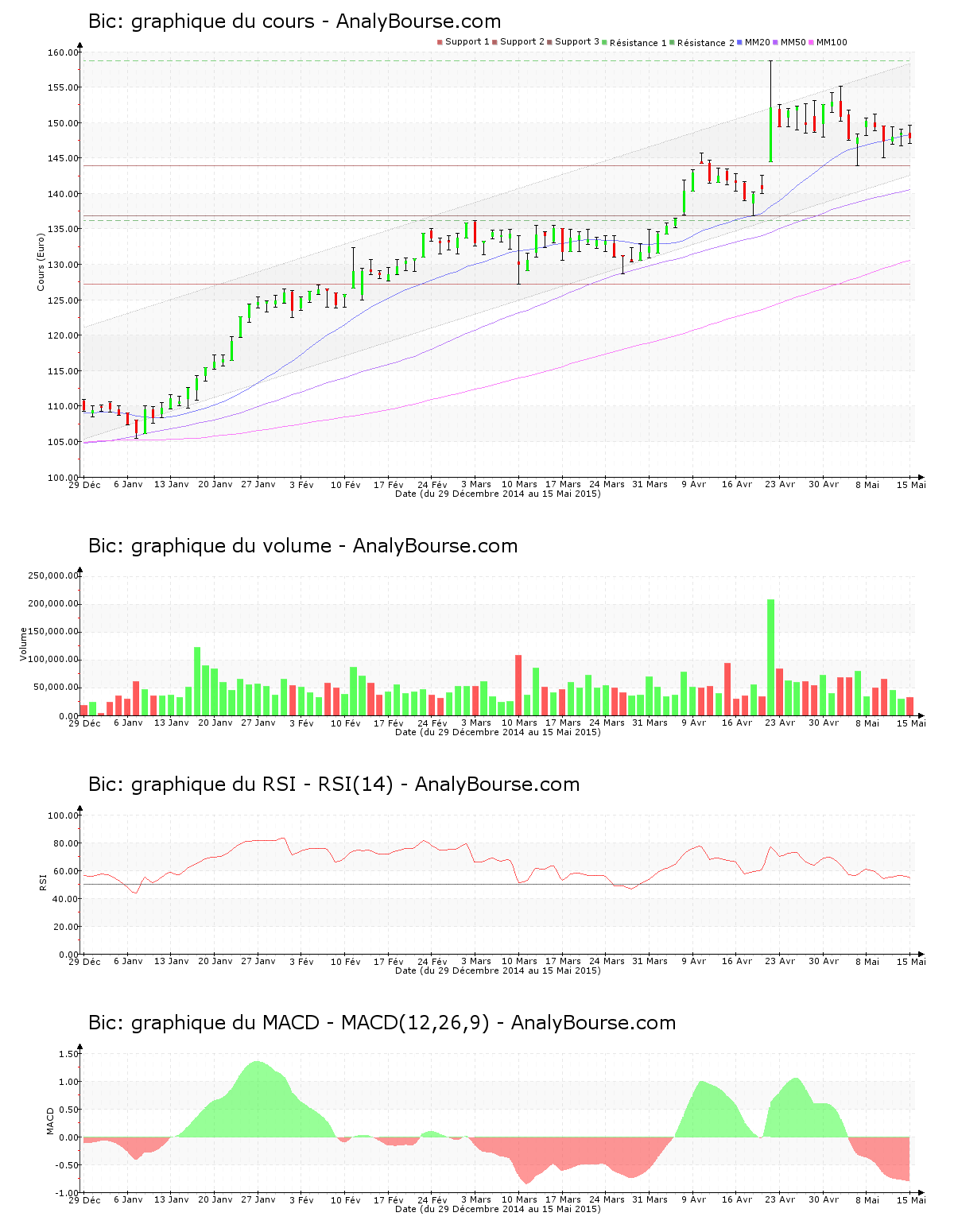 La valeur Bic possède une moyenne mobile sur 20 jours située au-delà de sa moyenne mobile sur 50 jours, qui est quant à elle placée au-dessus de sa moyenne mobile sur 100 jours. Le comportement de l’action est donc en progression sur le long terme. La moyenne mobile sur 50 jours de l’action Bic se localise maintenant au-delà de sa moyenne mobile sur 100 jours depuis 92 jours. Ensuite, on constate que ces cinq dernières séances le MACD est en conséquente baisse. C’est à présent une évolution du cours en importante régression qu’il dessine sur le court-moyen terme. Pour finir, en ce qui concerne le RSI, on repère qu’il est assez stable ces derniers jours. C’est par conséquent encore dans le niveau neutre qu’il se situe.