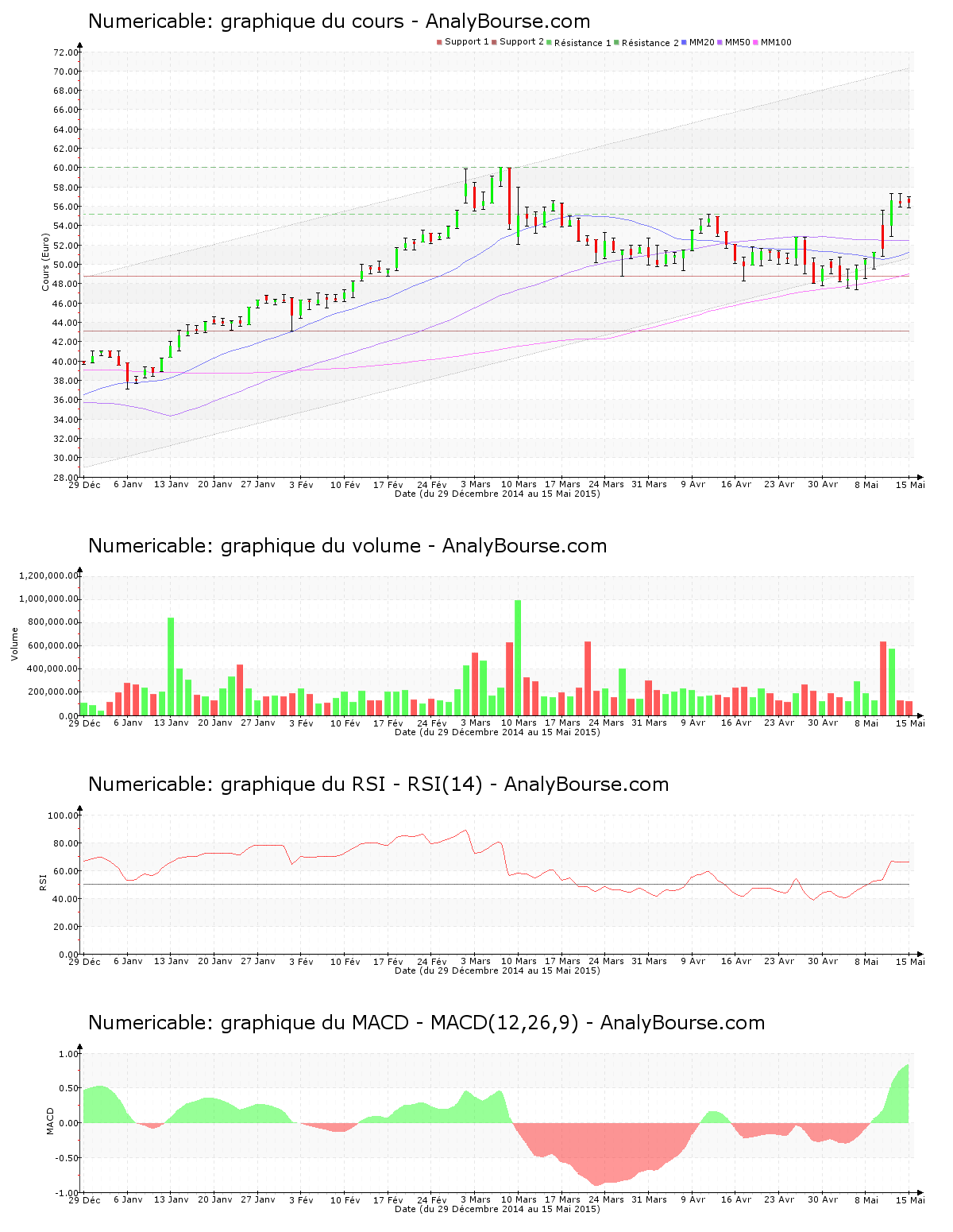 Le RSI est en hausse ces derniers jours. Il se localise à présent au niveau d’achat. De son côté, depuis dorénavant 71 séances, la moyenne mobile sur 50 jours de la valeur Numericable se localise au-delà de sa moyenne mobile sur 100 jours. On repère que l’indicateur MACD est en ferme progression ces derniers jours. Il révèle maintenant une tendance du cours en grande hausse sur le moyen terme. L’indicateur MACD est passé en secteur positif lundi dernier, ce qui peut montrer un engagement d’une trajectoire haussière à long terme pour Numericable.
