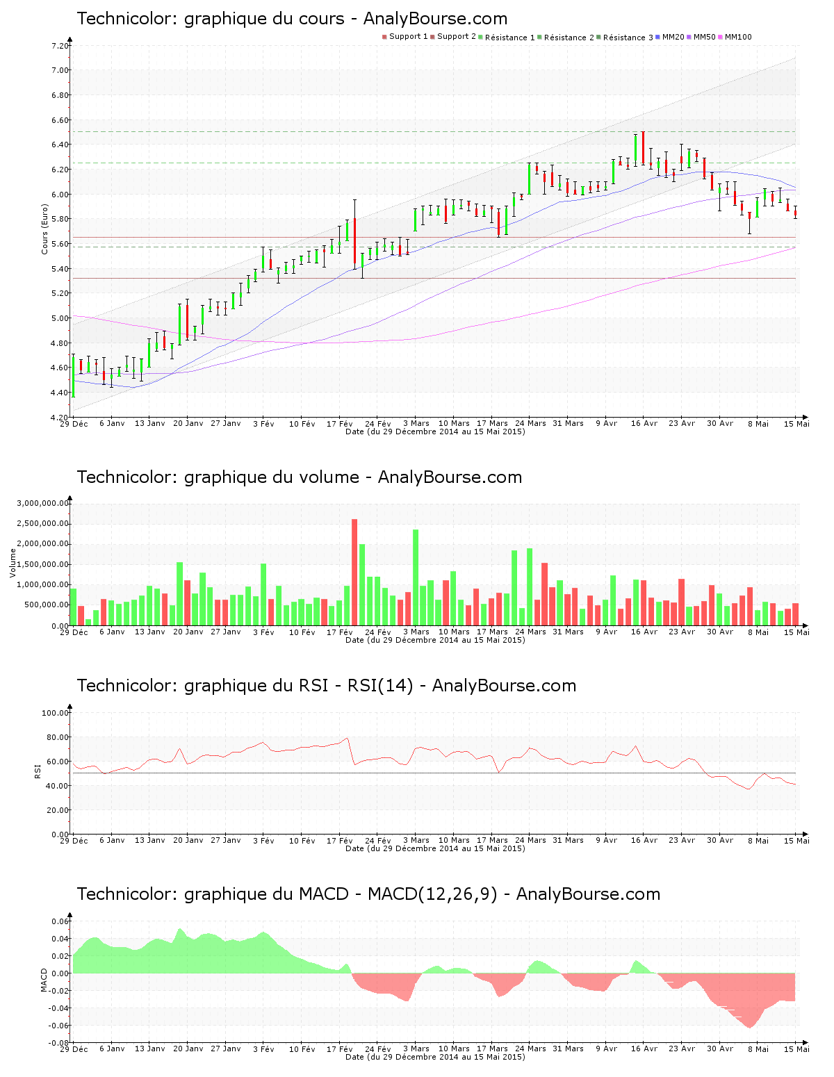 Côté indicateurs, le RSI est ces cinq dernières séances plutôt stable. C’est donc encore au niveau de vente que ce dernier se trouve. L’indicateur MACD est cette semaine en hausse. C’est malgré ceci toujours une évolution du titre en baisse qu’il dessine à moyen-court terme. Pour finir, la moyenne mobile sur vingt jours de la valeur Technicolor se situe au-delà de la moyenne mobile sur cinquante jours, qui se trouve quant à elle au-dessus de la moyenne mobile sur cent jours. Le développement de l’action est par conséquent en croissance sur le long terme. Cela fait maintenant 82 séances que la moyenne mobile sur vingt jours de la valeur Technicolor se situe au-delà de sa moyenne mobile sur cinquante jours.