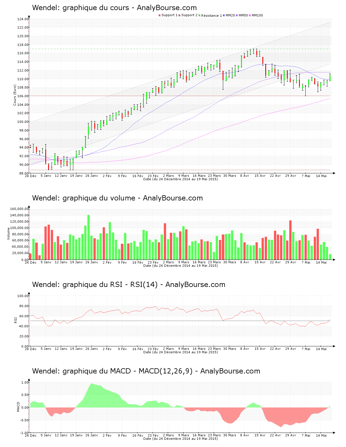 En ce qui concerne les indicateurs, l’indicateur MACD est aujourd’hui en grande croissance. Ce mardi, le MACD est passé en terrain positif, ce qui pourrait caractériser un amorcement de tendance haussière pour la valeur Wendel sur le long terme. Le RSI est en augmentation ce mardi. Il est passé au niveau d’achat, ceci peut représenter un commencement d’une trajectoire haussière pour l’action Wendel à longue échéance.