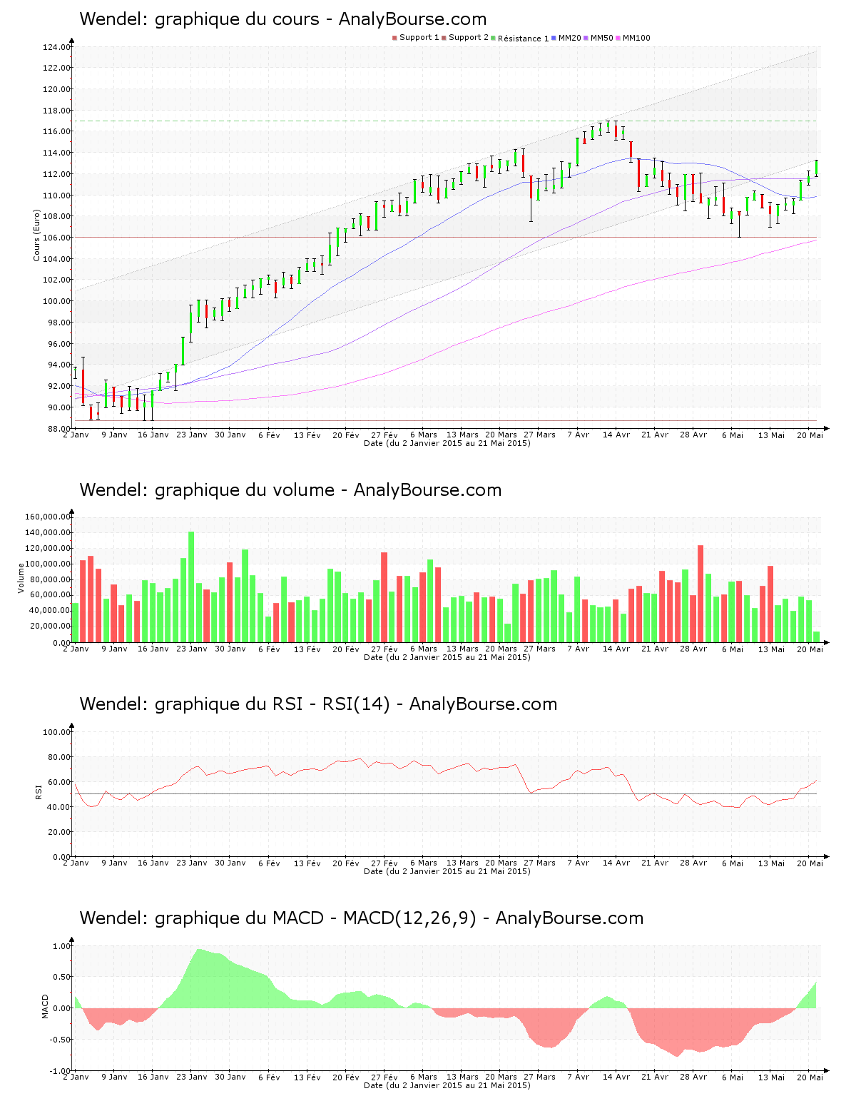La valeur Wendel est à présent en hausse incessante depuis 6 séances de cotations. Matérialisée par un cours haussier de 4.48%, le cours de Wendel subit par conséquent depuis le jeudi 14 mai 2015 une ferme pression acheteuse. L’action Wendel est ce jeudi sollicitée, avec un mouvement en augmentation de 1.25%, avec un volume à 09:33 d’environ 14000 titres échangés. L’action atteint dorénavant un montant de 113.100 €. Caractérisée par un parcours haussier de 0.45%, Wendel subissait hier un équilibre des forces. Le mouvement haussier reprend ainsi aujourd’hui. Le cours se développe maintenant à proximité de la résistance des 117.000 €.