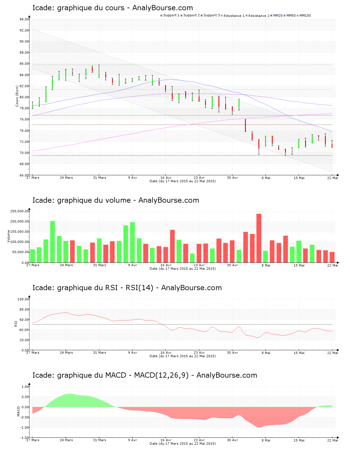 Du côté des indicateurs, depuis dorénavant 86 séances, la moyenne mobile sur 50 jours de la valeur Icade se localise au-delà de sa moyenne mobile sur 100 jours. De son côté, le RSI est stable ces cinq derniers jours. C’est ainsi encore au niveau de vente que ce dernier se place. Pour terminer, l’indicateur MACD est ces cinq dernières séances de cotations en importante hausse. C’est finalement une évolution du titre en ferme augmentation que ce dernier révèle à moyen terme. Mercredi dernier, le MACD est passé en secteur positif, ceci peut dessiner une ébauche d’une trajectoire en augmentation sur une longue période pour Icade.