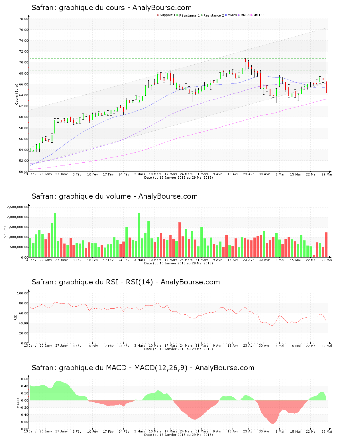 Ces informations constituent une analyse technique de la valeur Safran au samedi 30 mai 2015. Cette analyse peut être invalidée par des éléments plus récents, et ne constitue en aucune manière une incitation d’achat ou de vente sur les marchés financiers. Le lecteur reste libre et responsable de l’interprétation et de l’usage faits de ces informations.