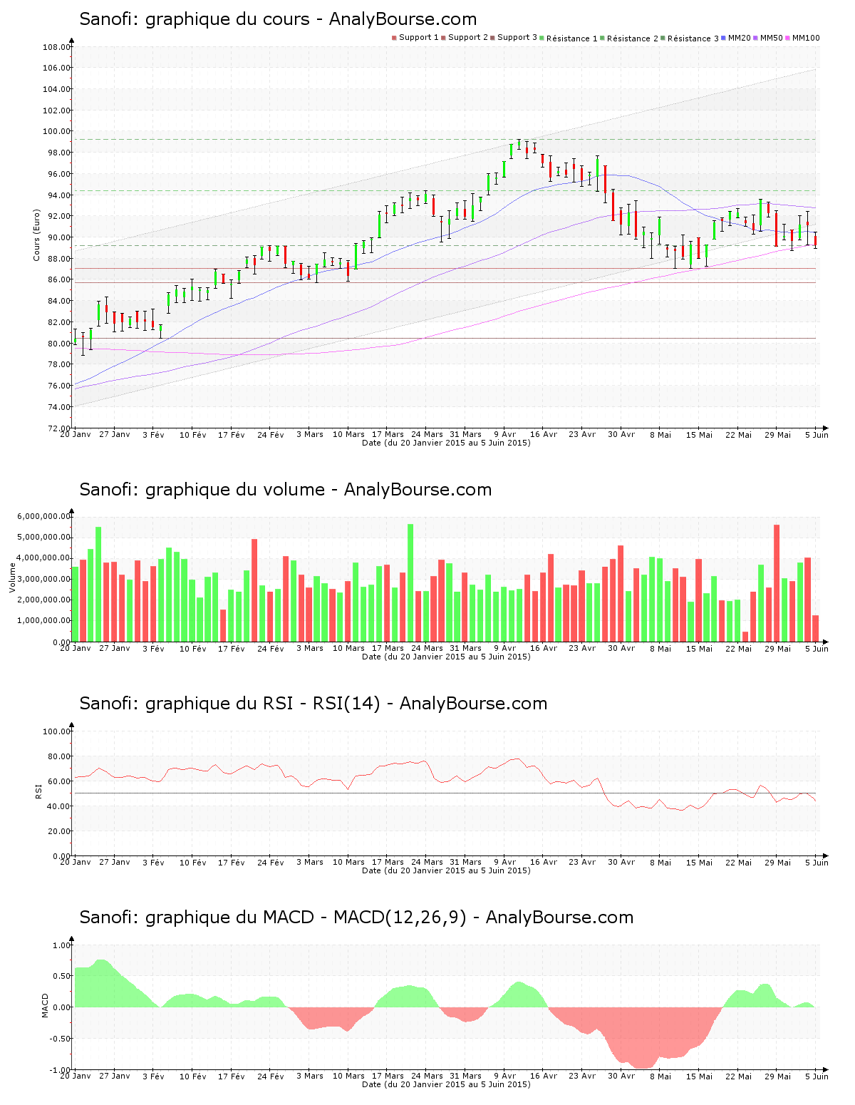 Avec un volume à 12:58 d’à peu près 1.3 million de titres échangés, l’action Sanofi est aujourd’hui attaquée, avec un comportement en diminution de 2.05%. Partant de 91.150 € pour parvenir à 89.280 €, l’action diminue finalement de 1.870 €. Sanofi était assez stable hier, avec un cours croissant de 0.03%. L’action reprend ainsi son parcours baissier. Le titre se développe à présent à proximité du support des 87.030 €. L’action navigue en deçà de son canal. Elle a de fait dépassé aujourd’hui la zone inférieure du canal dans lequel cette dernière s’enfermait depuis quelques temps.