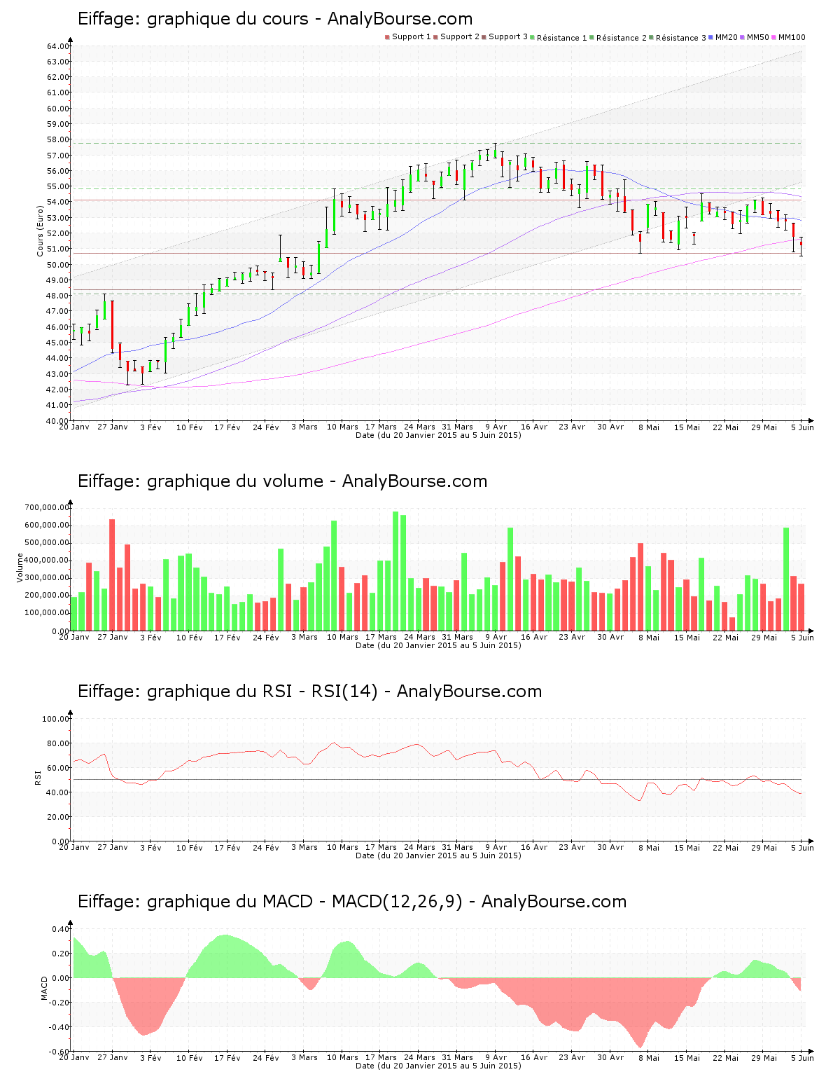 L’action Eiffage n’avait pas passé ce seuil depuis le jeudi 5 mars 2015. Le bilan est défavorable ces derniers jours pour la valeur Eiffage, avec un cours baissier de 3.65%. Partant de 53.160 € pour parvenir à 51.220 € ces dernières séances, cette dernière se déprécie désormais de 1.940 €. La volonté d’achat sur Eiffage la semaine dernière était neutre, caractérisée par un mouvement baissier de 0.26%. L’action reprend donc son parcours en baisse. Le cours se développe à présent proche du support des 50.700 €. Enfin, observons, avec un taux de 6.65% écartant cette semaine le maximum du minimum, une manifeste nervosité sur Eiffage. La valeur ne se cantonne plus dans le canal à l’intérieur duquel cette dernière oscillait ces dernières semaines. Elle se trouve finalement très en-dessous de son canal.