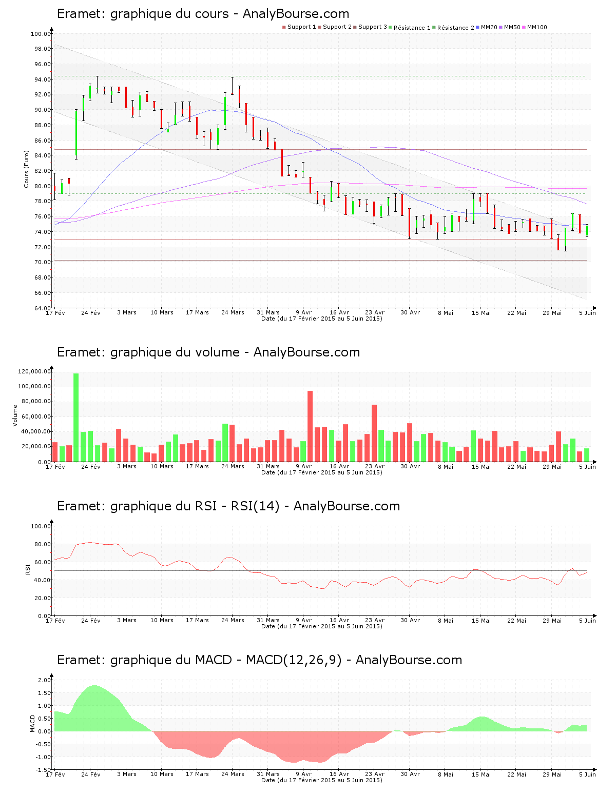 Pour l’indicateur MACD, on note qu’il est en grande croissance ces derniers jours. Ce dernier indique finalement une tendance du titre en conséquente croissance sur le moyen-court terme. Ensuite, l’action Eramet possède une moyenne mobile sur 20 jours placée en deçà de sa moyenne mobile sur 50 jours, qui est quant à elle située en deçà de sa moyenne mobile sur 100 jours. Sur le long terme, l’action dévoile ainsi un cours baissier. Cela fait désormais 37 séances que la moyenne mobile sur 20 jours de l’action Eramet se place en deçà de sa moyenne mobile sur 50 jours. Enfin, on remarque que ces dernières séances le RSI est assez stable. Ce dernier se trouve ainsi toujours dans le niveau neutre.