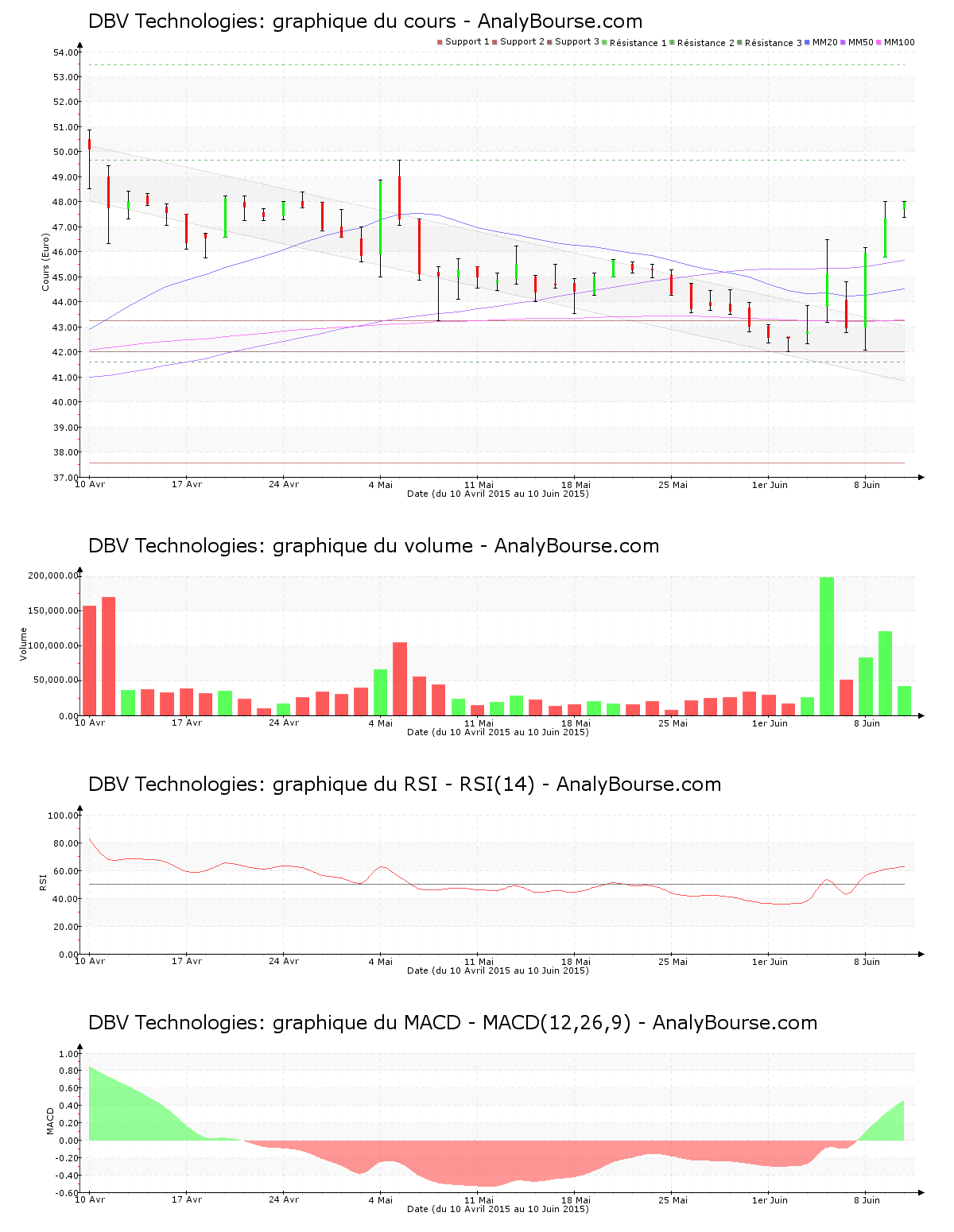 Avec un comportement haussier de 12.10%, le résultat est franchement bon sur une semaine de cotations pour DBV Technologies. Le titre croît de manière similaire en un mois, avec un parcours haussier de 7.05%. DBV Technologies explose depuis un an, avec un développement haussier de 143.18%.