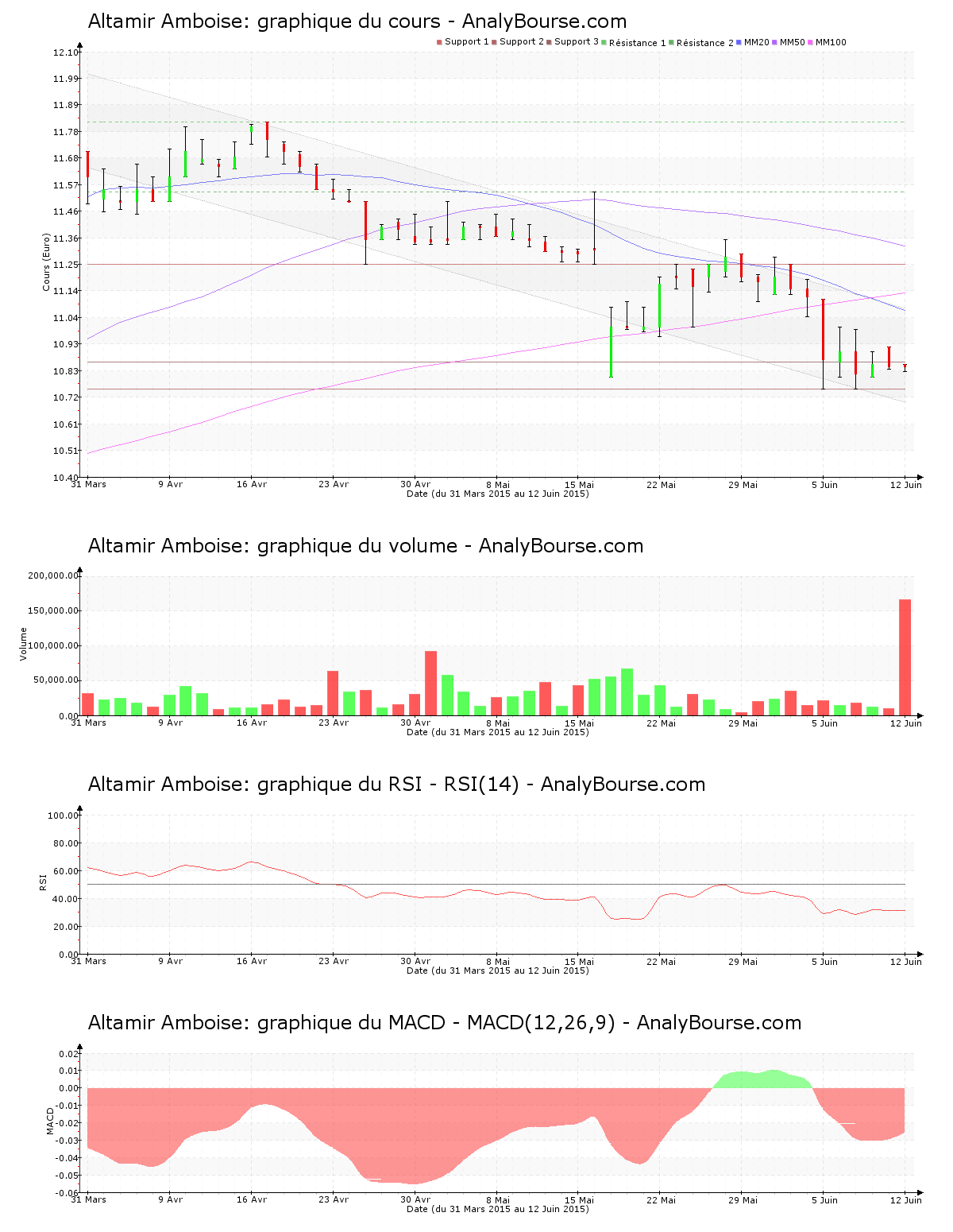 En ce qui concerne les indicateurs, on repère que ces dernières séances le RSI est stable. C’est donc toujours au niveau de vente qu’il se place. De son côté, depuis dorénavant 83 jours de cotations, la moyenne mobile sur 50 jours de la valeur Altamir Amboise se positionne au-dessus de sa moyenne mobile sur 100 jours. Pour terminer, l’indicateur MACD est cette semaine plutôt stable. Il signale ainsi toujours une évolution du titre plutôt stable à court-moyen terme.