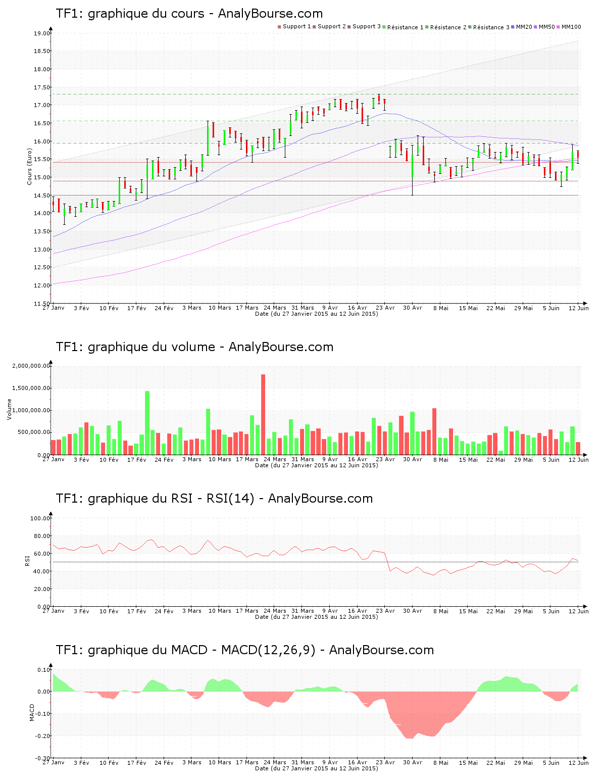 Ces informations constituent une analyse technique de la valeur TF1 au dimanche 14 juin 2015. Cette analyse peut être invalidée par des éléments plus récents, et ne constitue en aucune manière une incitation d’achat ou de vente sur les marchés financiers. Le lecteur reste libre et responsable de l’interprétation et de l’usage faits de ces informations.