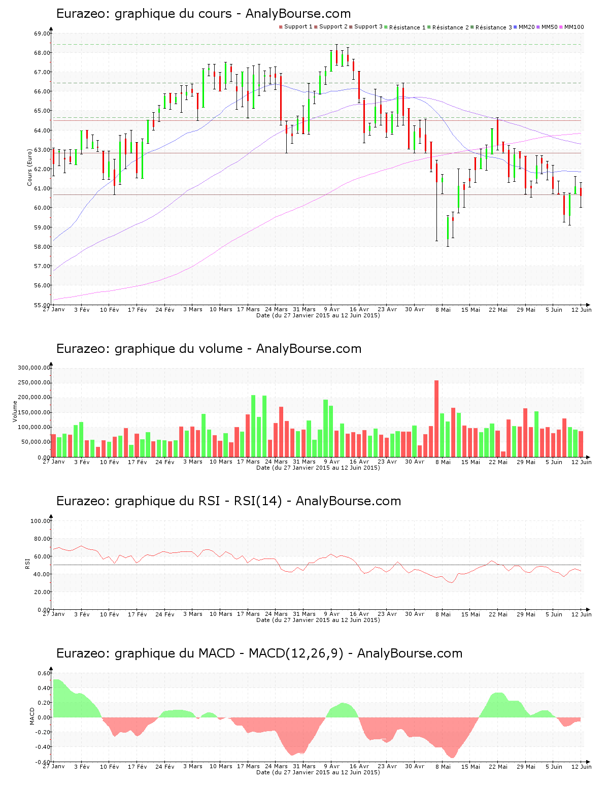 Concrétisée par un cours décroissant de 0.62%, Eurazeo connaît encore cette semaine une sensible stabilité. L’action Eurazeo stagnait déjà la semaine dernière, avec un comportement baissier de 0.03%. Elle se valorise par conséquent désormais à 60.600 €. Le cours a franchi le support des 60.660 € cette semaine. Le support suivant se positionne à 58.000 €.