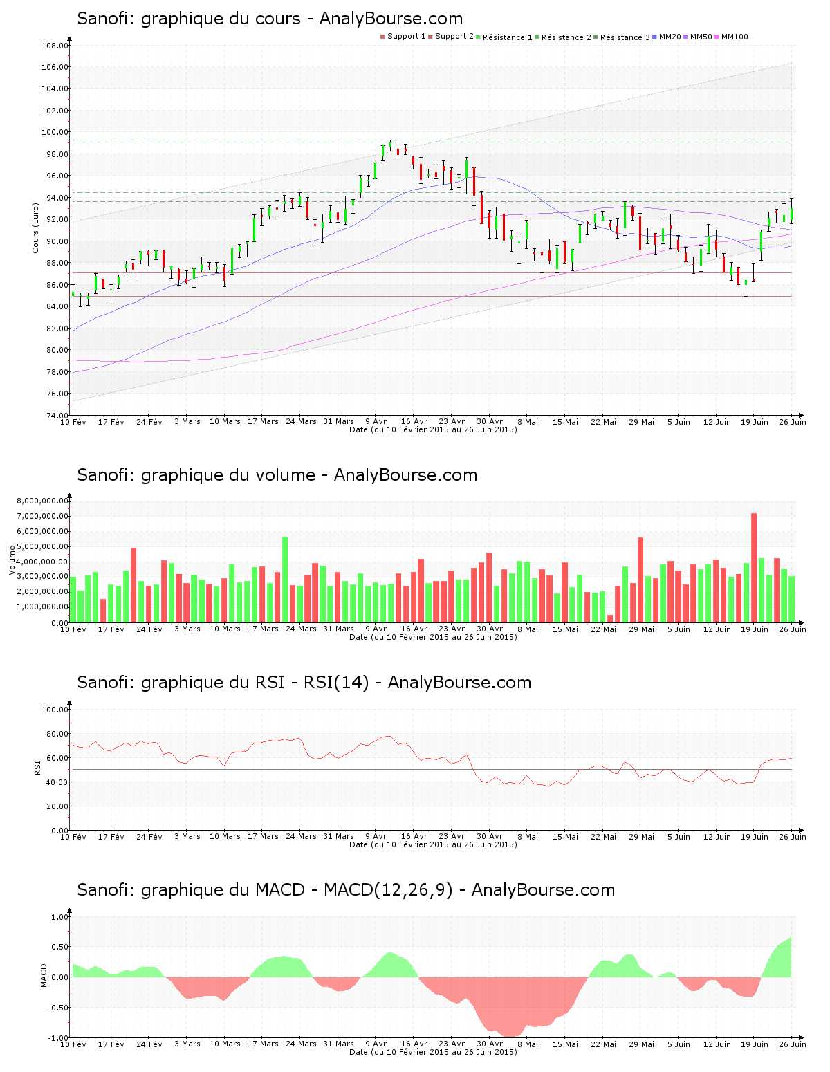Du côté des indicateurs, voici finalement 31 séances que la moyenne mobile sur 20 jours de la valeur Sanofi se positionne en deçà de sa moyenne mobile sur 50 jours. Ensuite, l’indicateur RSI est en hausse ces derniers jours. C’est à présent au niveau d’achat que ce dernier se trouve. Pour finir, le MACD est en importante augmentation ces cinq derniers jours de cotations. Il montre désormais une évolution du cours en importante hausse sur le moyen-court terme. Lundi dernier, le MACD est passé en terrain positif, ce qui pourrait signaler une amorce d’une évolution croissante à long terme pour Sanofi.