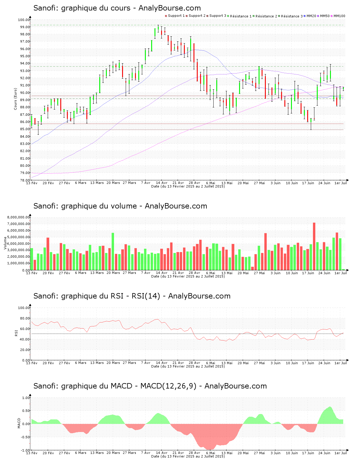 Pour les indicateurs, pour le MACD, on relève que ce dernier est plutôt stable ce jour. C’est donc encore une évolution du cours en forte progression que ce dernier caractérise à moyen-court terme. En ce qui concerne le RSI, on relève que ce dernier est en augmentation ce jour. Il a basculé au niveau d’achat, cela peut représenter un commencement d’une évolution en augmentation pour l’action Sanofi à longue échéance.