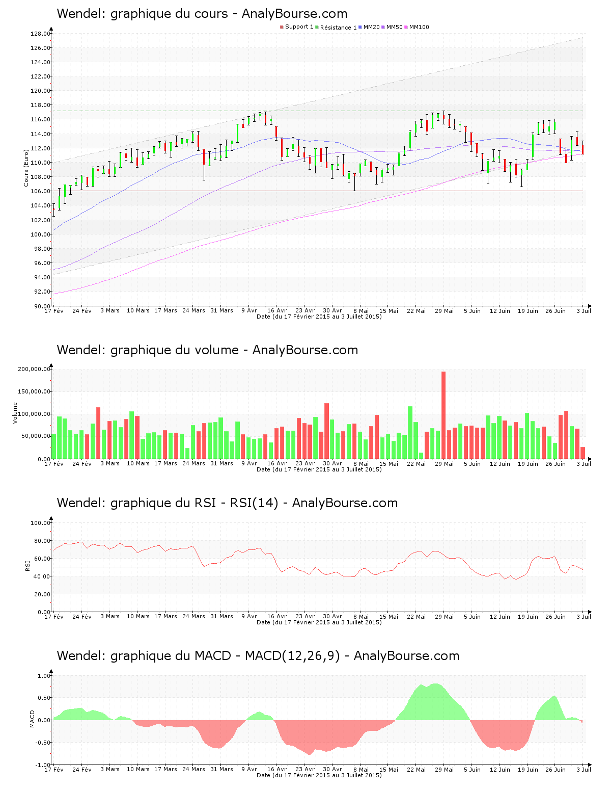 Pour les indicateurs, on remarque que ce vendredi le MACD est en vigoureuse régression. L’indicateur MACD est passé en territoire négatif aujourd’hui, cela peut suggérer un amorcement d’une trajectoire baissière sur une longue période pour la valeur Wendel. On note que ce jour le RSI est en diminution. Il est passé au niveau de vente, ce qui pourrait représenter un prélude de tendance décroissante à longue échéance pour l’action Wendel.