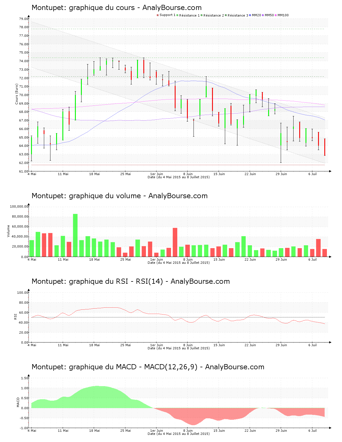 La valeur Montupet est encore en décroissance ce mercredi 8 juillet, avec un cours en diminution de 1.83%, avec environ 15000 actions échangées à 16:01. Elle était déjà en régression hier, avec un cours baissier de 1.42%. La valeur diminue à présent de 1.170 €, partant de 64.000 € pour se rendre à 62.830 €. Il s’agit de la première fois que la valeur Montupet franchit ce niveau depuis le jeudi 30 avril 2015. Montupet évolue ce mercredi 8 juillet dans un range de 3.17%, ce qui indique des échanges assez chahutés sur le cours. Le mouvement du titre l’entraîne désormais près du support des 61.720 €.