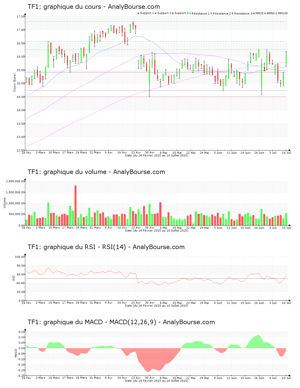 Côté indicateurs, l’indicateur RSI est stable ces derniers jours. C’est par conséquent encore dans le niveau d’achat que ce dernier se localise. Pour finir, le MACD est ces derniers jours en régression. Il indique à présent une évolution du titre assez stable sur le court-moyen terme. Mardi dernier, le MACD est passé du côté négatif, ceci peut suggérer un enclenchement d’une trajectoire décroissante à longue échéance pour TF1.
