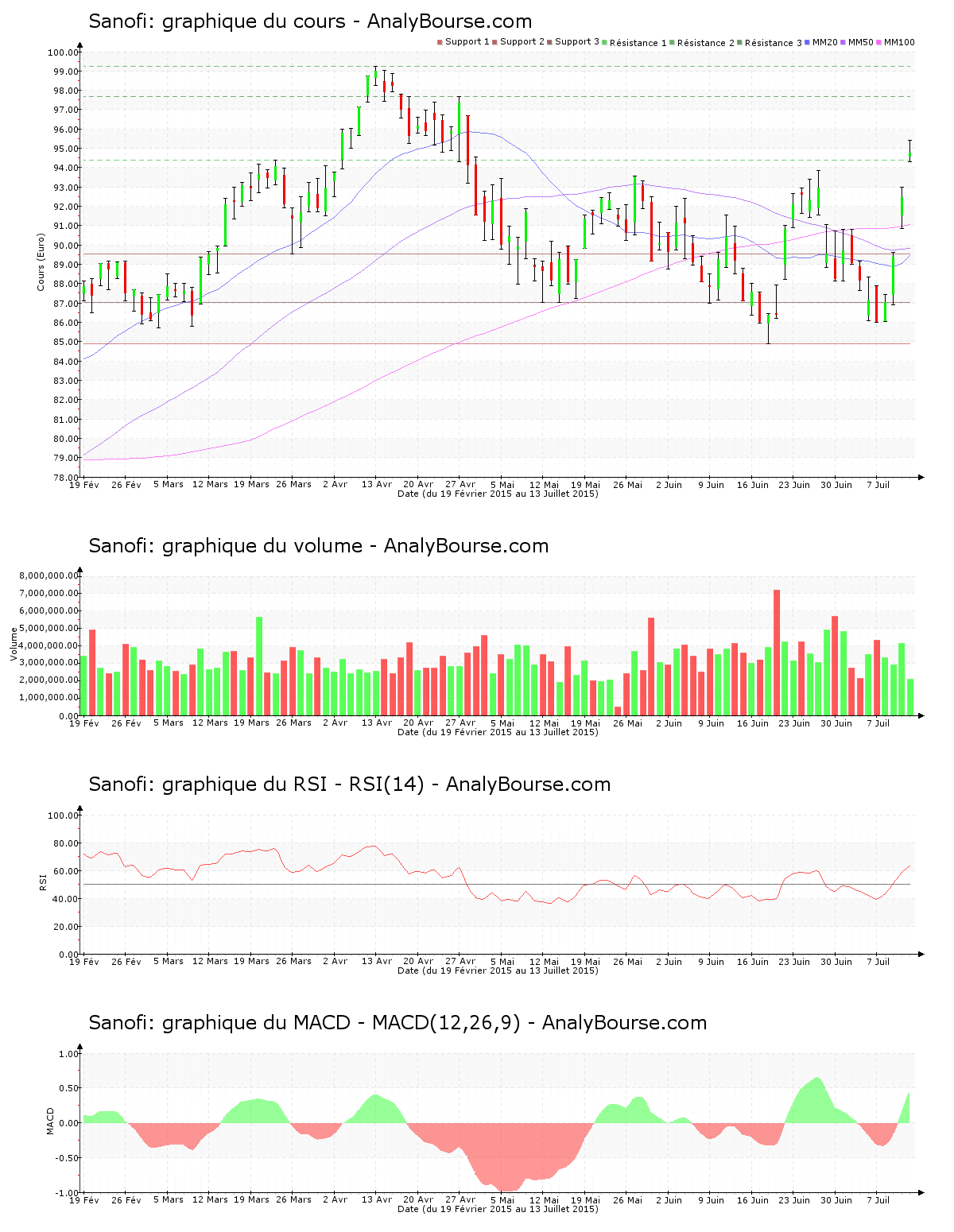 La valeur Sanofi est à présent en croissance depuis 4 jours. La sollicitation sur le cours de Sanofi depuis mercredi dernier est donc particulièrement vigoureuse, caractérisée par un développement haussier de 10.14%. La valeur Sanofi s’échange à son niveau du mardi 28 avril 2015. Avec 2 millions de titres échangés à 13:27, avec un comportement haussier de 2.47%, l’action Sanofi croît ce lundi 13 juillet. L’évolution croissante perd de l’ampleur. Sanofi augmente dorénavant de 2.280 €, débutant à 92.470 € pour accéder à 94.750 € ce lundi. Incarnée par un cours haussier de 3.46%, la valeur connaissait vendredi dernier une conséquente pression acheteuse. Le cours a passé la résistance des 94.400 € ce lundi 13 juillet. La prochaine résistance se situe à 97.670 €.