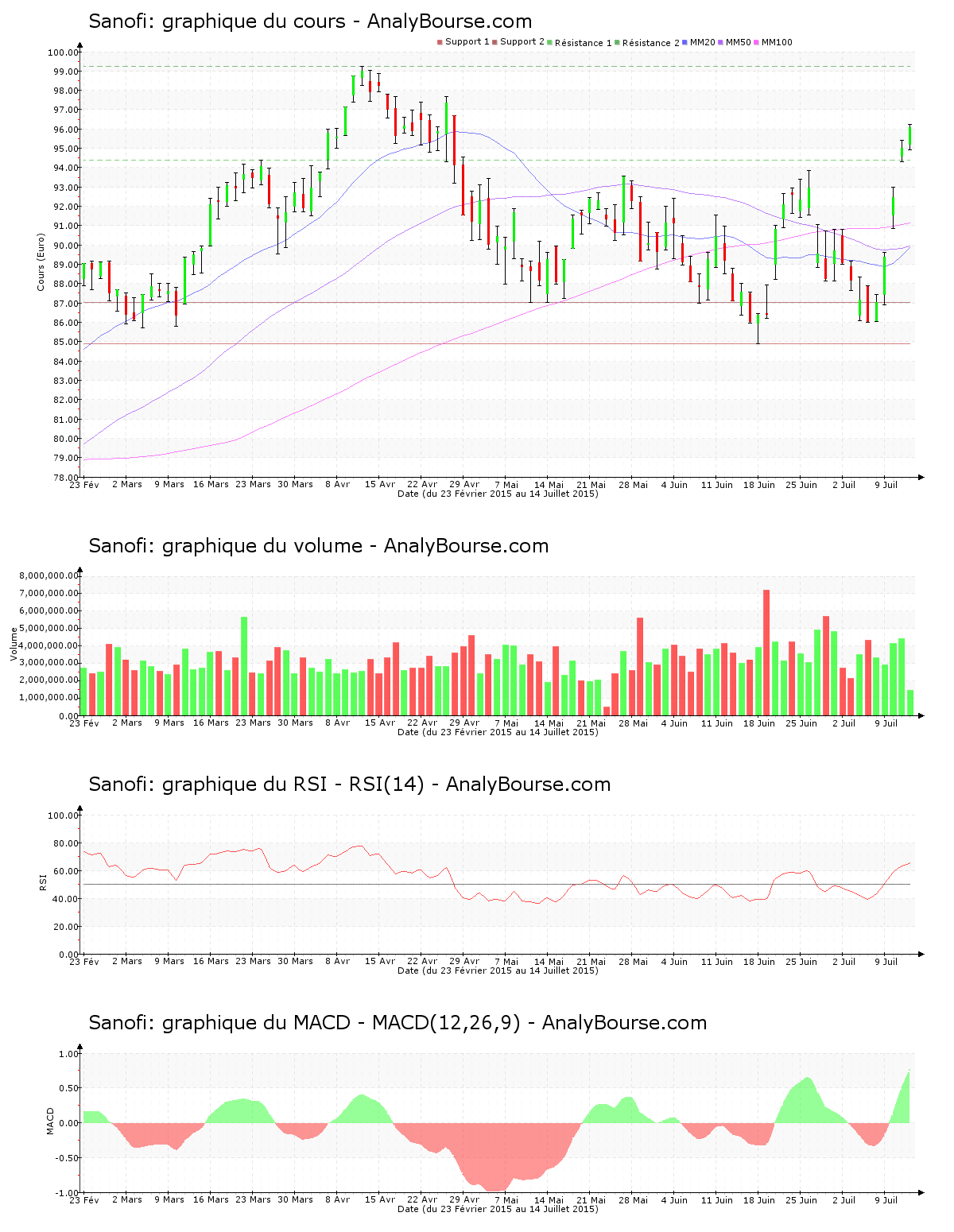 Avec un cours haussier de 1.09%, le parcours est toujours positif ce mardi 14 juillet pour la valeur Sanofi, avec un volume à 16:27 d’environ 1.4 million de titres échangés. La valeur augmente maintenant de 1.040 €, débutant à 95.020 € pour accéder à 96.060 €. Avec un cours en progression de 2.76%, Sanofi explosait hier. L’action atténue ainsi son parcours croissant. Voilà dorénavant cinq jours de cotations que l’action Sanofi est en progression ininterrompue. Avec un cours croissant de 11.66%, le titre de Sanofi est donc en vigoureuse hausse depuis mercredi dernier. Il s’agit de la première fois depuis le mardi 28 avril 2015 que l’action Sanofi dépasse ce seuil. Le développement du titre l’emmène dorénavant à proximité de la résistance des 99.230 €.