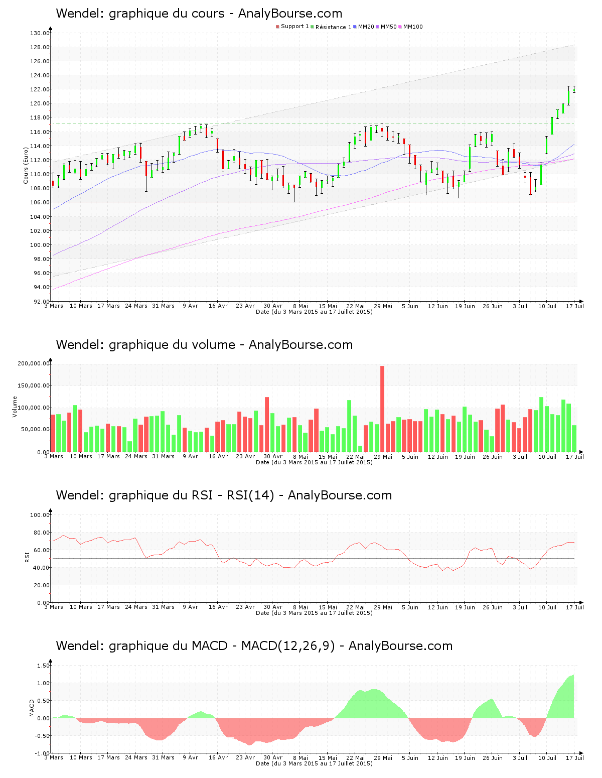 Ces informations constituent une analyse technique de l’action Wendel au dimanche 19 juillet 2015. Cette analyse peut être invalidée par des éléments plus récents, et ne constitue en aucune manière une incitation d’achat ou de vente sur les marchés financiers. Le lecteur reste libre et responsable de l’interprétation et de l’usage faits de ces informations.