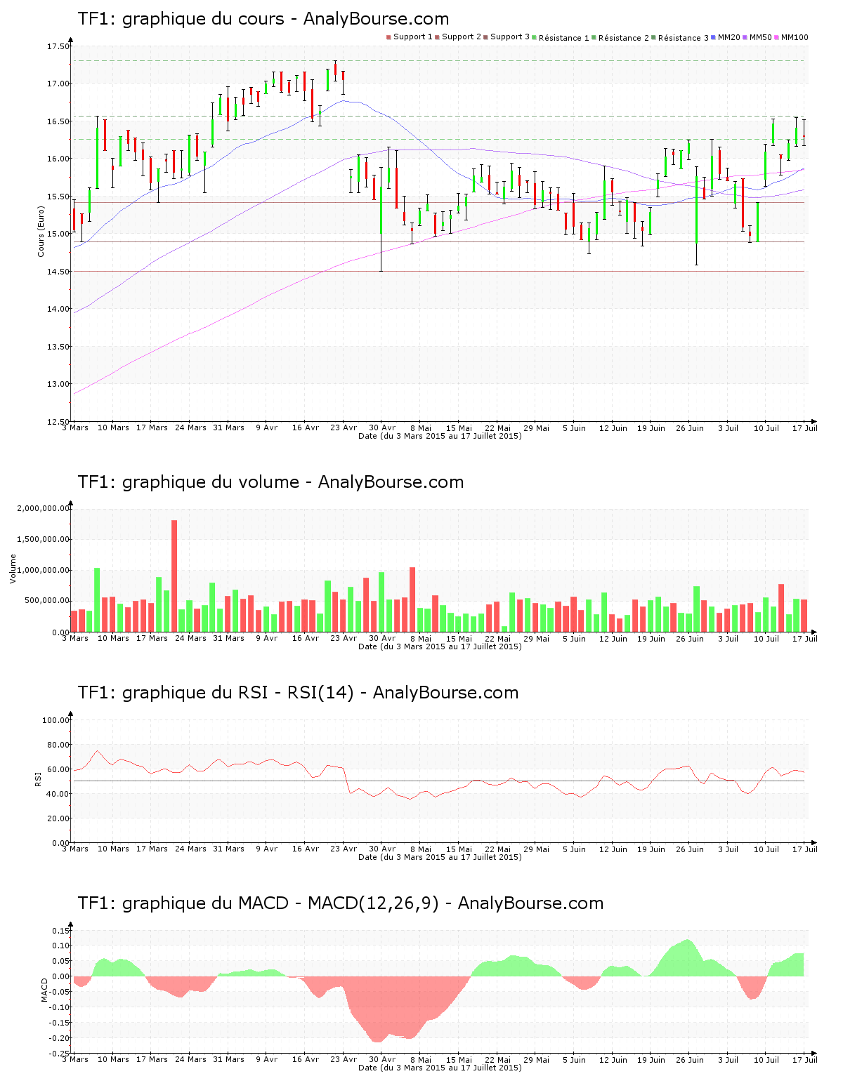Ces informations constituent une analyse technique de l’action TF1 au dimanche 19 juillet 2015. Cette analyse peut être invalidée par des éléments plus récents, et ne constitue en aucune manière une incitation d’achat ou de vente sur les marchés financiers. Le lecteur reste libre et responsable de l’interprétation et de l’usage faits de ces informations.