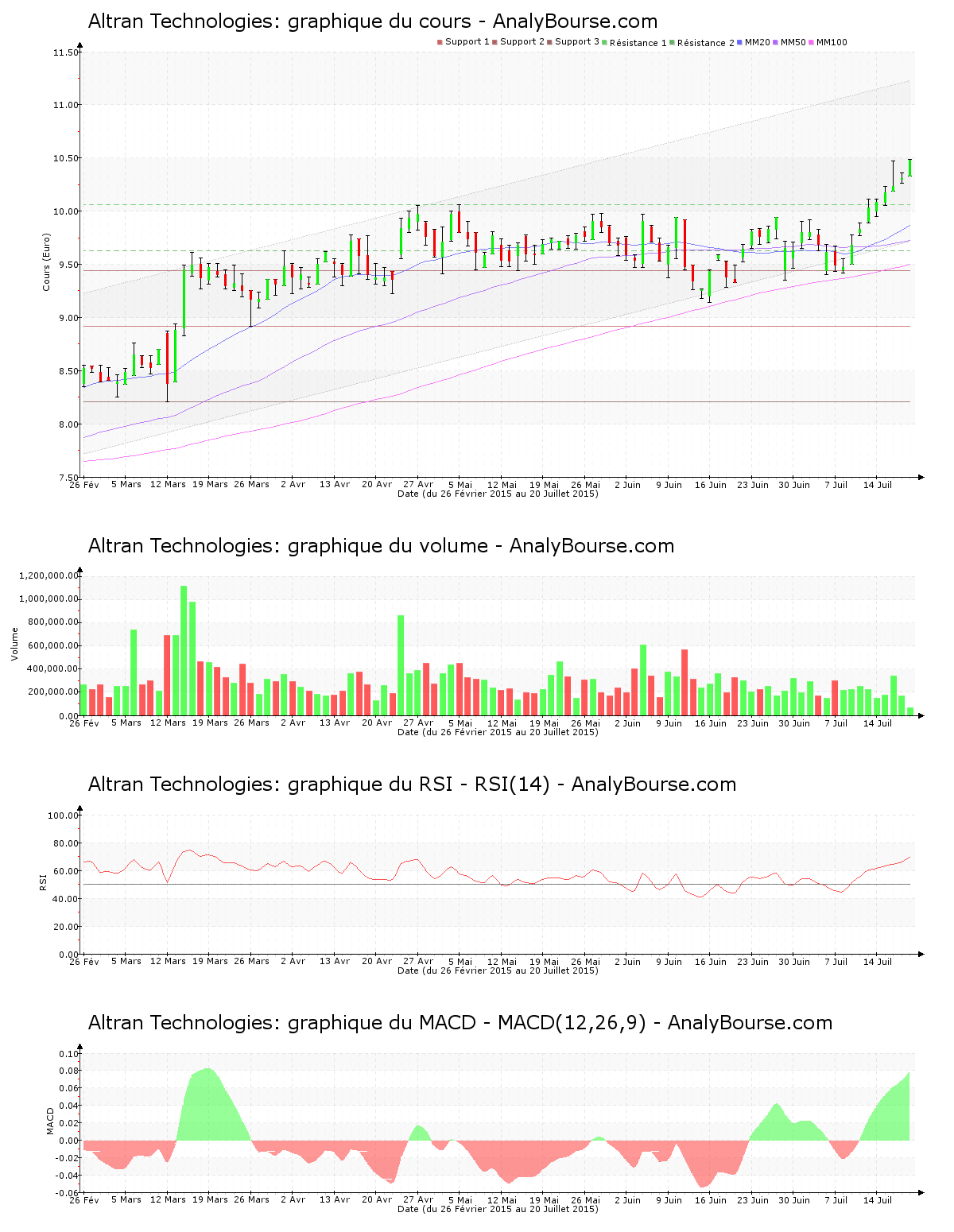 Avec à peu près 64000 titres échangés à 13:01, l’action Altran Technologies est toujours ce jour entourée, avec un mouvement en croissance de 1.65%. Avec un parcours haussier de 0.78%, elle s’enchérissait déjà vendredi dernier. Débutant à 10.310 € pour arriver à 10.480 €, l’action augmente dorénavant de 0.170 €. L’évolution en croissance de l’action Altran Technologies continue maintenant depuis 8 séances de cotations. Le titre de Altran Technologies montre ainsi depuis le jeudi 9 juillet 2015 une grande pression acheteuse, symbolisée par un cours haussier de 10.67%.