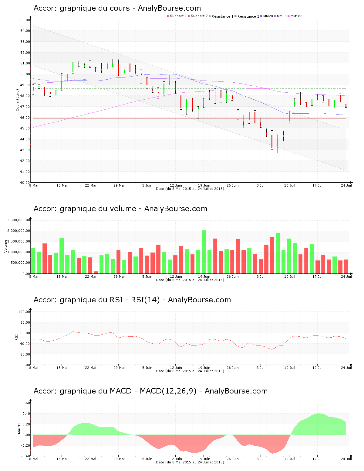 En ce qui concerne les indicateurs, concernant le MACD, on repère que ce dernier est en importante régression ces cinq derniers jours. Il dévoile néanmoins encore une tendance du cours en ferme progression sur le court-moyen terme. Ensuite, la moyenne mobile sur vingt jours de la valeur Accor se situe en deçà de la moyenne mobile sur cinquante jours, qui se situe pour sa part en deçà de la moyenne mobile sur cent jours. L’action révèle ainsi un parcours décroissant sur le long terme. Pour finir, on observe que ces derniers jours l’indicateur RSI est en décroissance. Il se place finalement dans le niveau neutre.