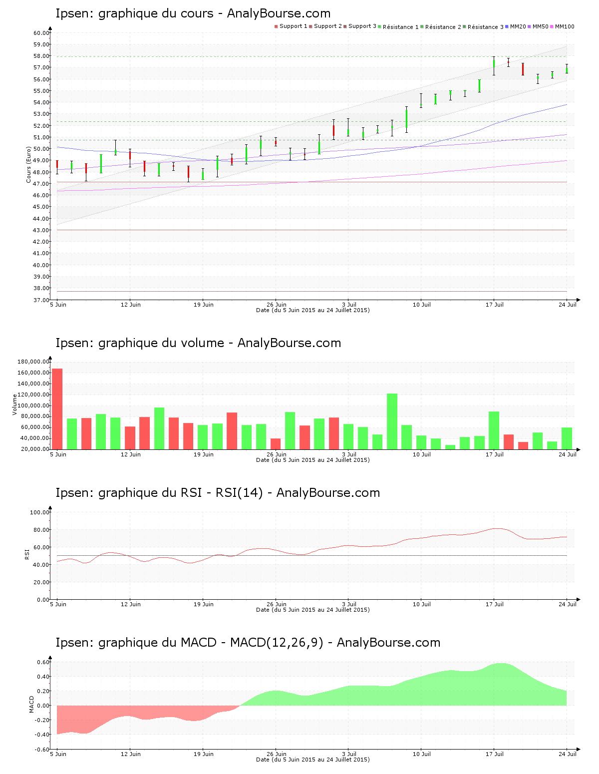 Côté indicateurs, la moyenne mobile sur vingt jours de l’action Ipsen se situe au-dessus de la moyenne mobile sur cinquante jours, qui se trouve elle-même au-dessus de la moyenne mobile sur cent jours. La valeur révèle donc un parcours haussier à longue échéance. Pour sa part, l’indicateur RSI est ces cinq derniers jours de cotations plutôt stable. C’est donc toujours au niveau d’achat qu’il se positionne. Pour terminer, le MACD est ces cinq dernières séances en grande décroissance. C’est malgré ceci encore une évolution du cours en vigoureuse croissance qu’il dévoile sur le moyen terme.