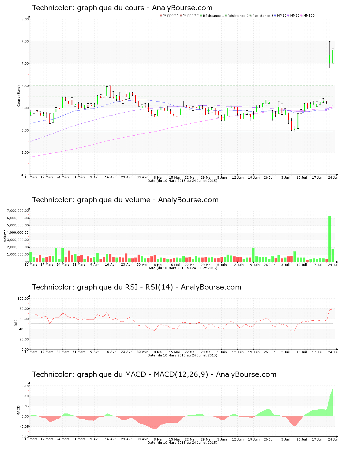 Ces informations constituent une analyse technique de la valeur Technicolor au dimanche 26 juillet 2015. Cette analyse peut être invalidée par des éléments plus récents, et ne constitue en aucune manière une incitation d’achat ou de vente sur les marchés financiers. Le lecteur reste libre et responsable de l’interprétation et de l’usage faits de ces informations.
