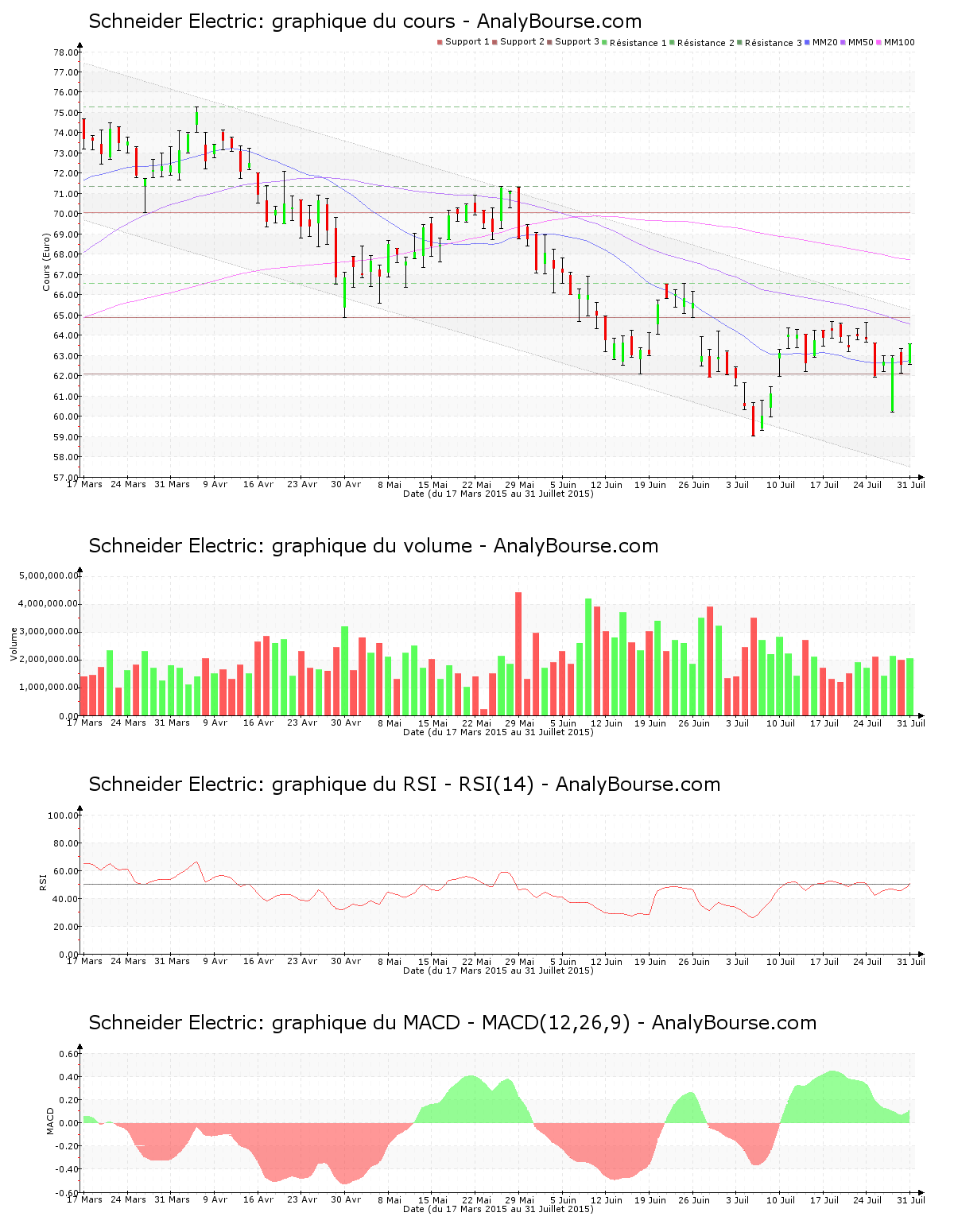 Pour les indicateurs, on observe que l’indicateur MACD est en progression ce vendredi. Il caractérise dorénavant une tendance du titre en vigoureuse augmentation sur le court-moyen terme. On observe qu’aujourd’hui le RSI est en croissance. Il a basculé dans le niveau d’achat, ceci peut montrer un commencement de tendance croissante pour l’action Schneider Electric à long terme.