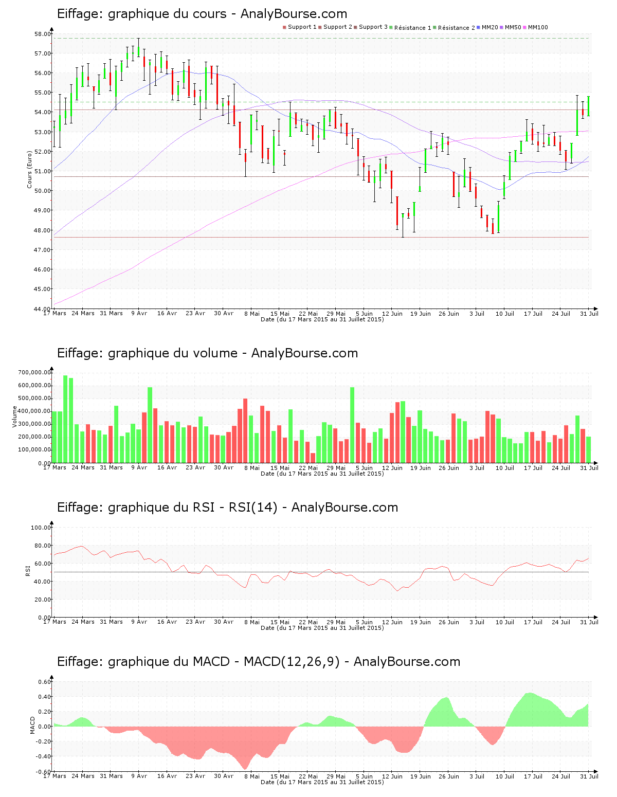 |Avec un parcours haussier de 5.26%, la valeur Eiffage bondit ces cinq dernières séances de cotations. Elle cote désormais à 54.790 €. Imprégnée par un cours baissier de 0.97%, Eiffage montrait la semaine dernière un équilibre des forces. La valeur reprend donc son développement en croissance. La valeur Eiffage n’a pas dépassé ce seuil depuis 66 séances. Le cours a dépassé la résistance des 54.510 € cette semaine. La résistance suivante se positionne à 57.750 €. On relève une relative volatilité cette semaine sur le cours, avec un taux de 7.36% éloignant les extrêmes de Eiffage.