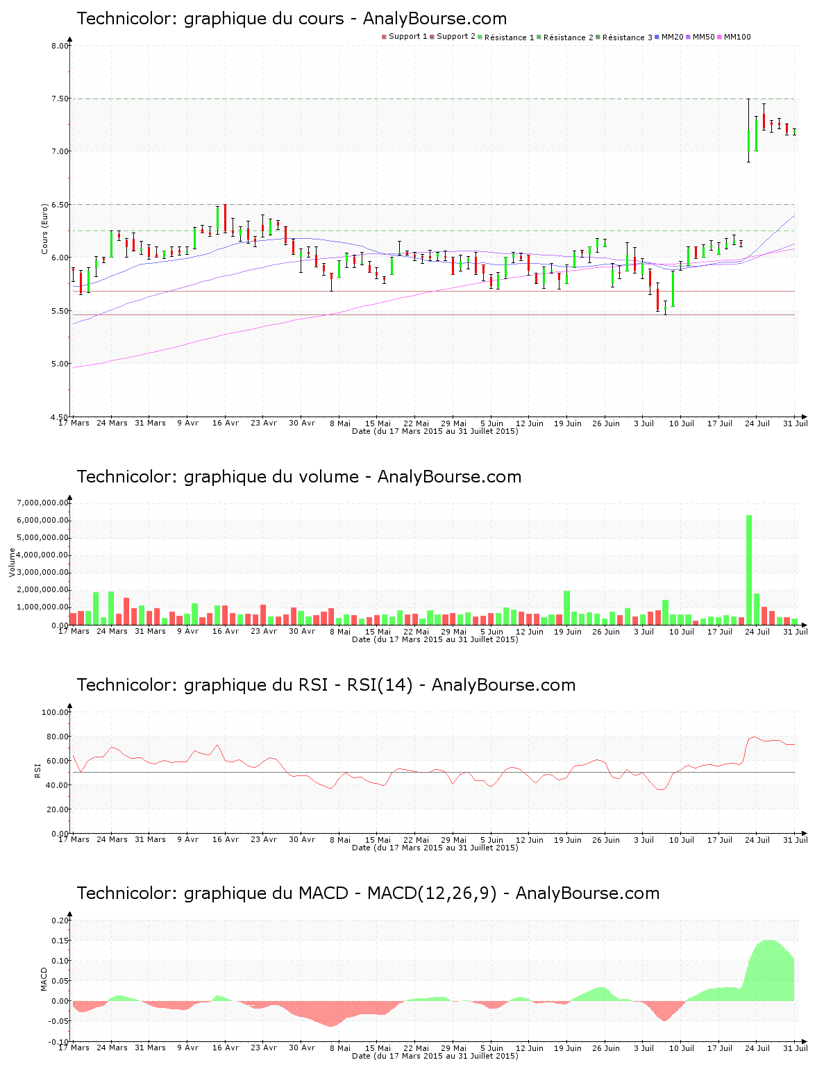 Technicolor est en décroissance ces dernières séances, avec un cours baissier de 1.37%. La valeur se revend maintenant à 7.200 €. Technicolor montrait à l’opposé la semaine dernière une ferme pression acheteuse, caractérisée par un cours en augmentation de 20.07%. La tendance se retourne ainsi vigoureusement ces dernières séances.