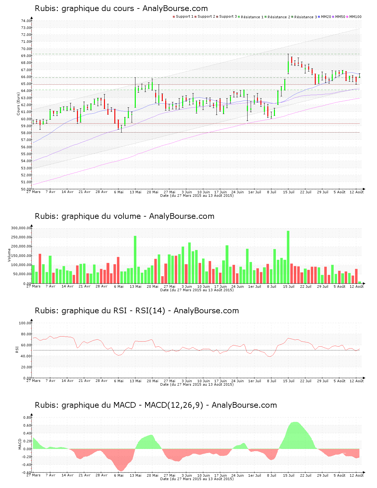 Avec un mouvement en croissance de 1.07%, Rubis est ce jeudi 13 août désiré, avec à peu près 9000 titres échangés à 10:26. La valeur atteint finalement la cotation de 65.970 €. Rubis diminuait par contre hier, avec un développement baissier de 0.99%. L’orientation s’inverse par conséquent légèrement ce jour. Le cours a passé la résistance des 65.880 € ce jeudi. La prochaine résistance se positionne à 69.200 €.