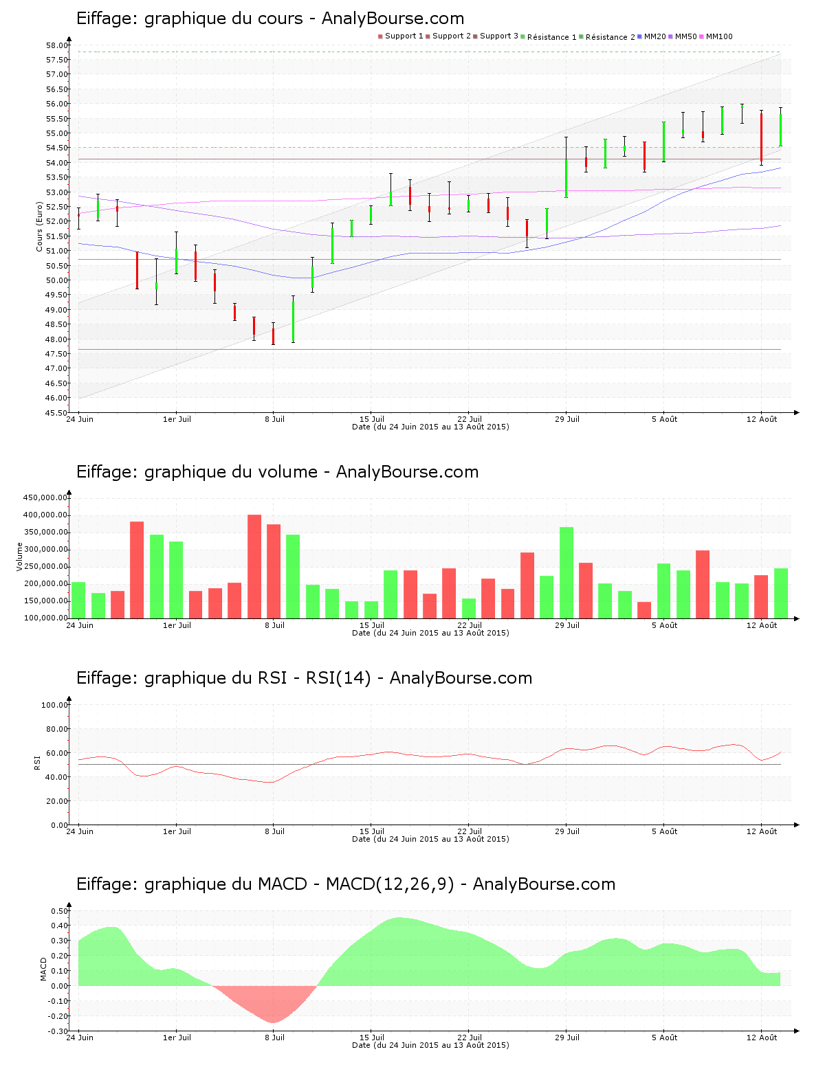 Dans un volume d’approximativement 246000 titres échangés à la clôture, la volonté d’achat sur Eiffage ce jour est remarquablement importante, symbolisée par un cours haussier de 2.94%. La valeur cote finalement à 55.620 €. Eiffage plongeait par contre hier, avec un développement baissier de 3.35%. La répartition acheteurs/vendeurs s’inverse par conséquent vigoureusement ce jeudi. Le titre a passé la résistance des 54.510 € aujourd’hui. La prochaine résistance se place à 57.750 €.