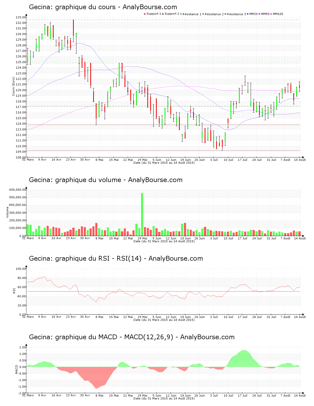 En ce qui concerne les indicateurs, le MACD est en vigoureuse décroissance ces cinq derniers jours. Il représente toutefois toujours une tendance du titre en forte augmentation à court-moyen terme. La moyenne mobile sur 50 jours de l’action Gecina se place finalement en deçà de sa moyenne mobile sur 100 jours depuis 40 séances. Pour terminer, concernant l’indicateur RSI, on relève que ce dernier est stable cette semaine. C’est ainsi encore au niveau d’achat que ce dernier se localise.