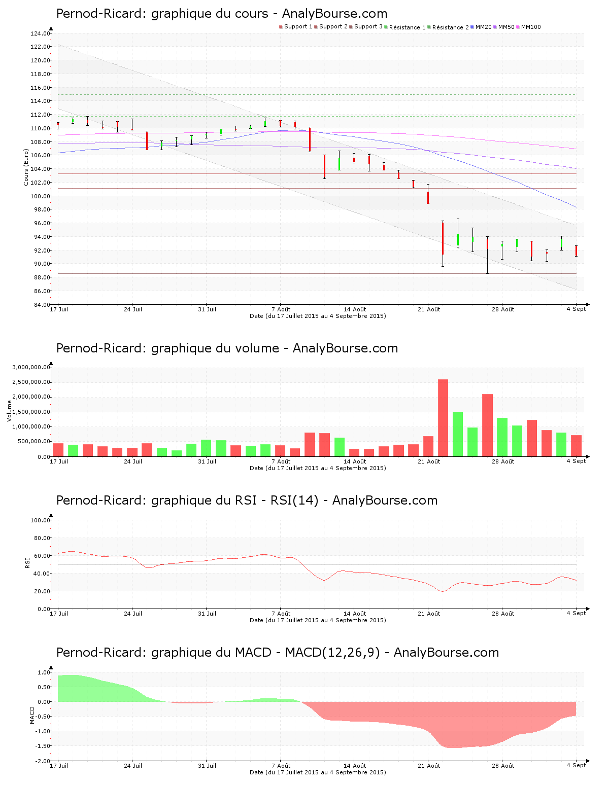 Ces informations constituent une analyse technique de l’action Pernod-Ricard au samedi 5 septembre 2015. Cette analyse peut être invalidée par des éléments plus récents, et ne constitue en aucune manière une incitation d’achat ou de vente sur les marchés financiers. Le lecteur reste libre et responsable de l’interprétation et de l’usage faits de ces informations.