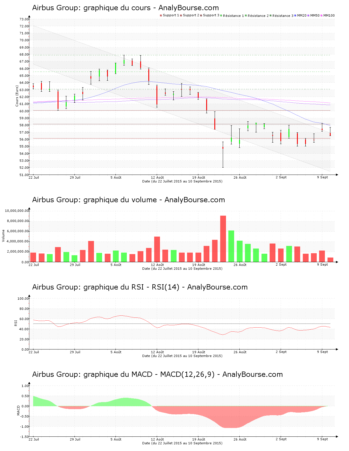 Pour les indicateurs, en ce qui concerne l’indicateur MACD, on repère que ce dernier est en vigoureuse augmentation ce jeudi 10 septembre. L’indicateur MACD est passé du côté positif ce jeudi, ce qui peut esquisser un engagement d’une évolution en progression sur la durée pour la valeur Airbus Group.