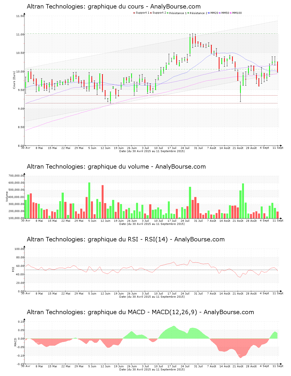 Côté indicateurs, on constate que cette semaine le RSI est plutôt stable. C’est donc toujours au niveau neutre qu’il se trouve. L’indicateur MACD est ces cinq dernières séances de cotations en importante croissance. Ce dernier représente à présent une évolution du cours en augmentation à moyen terme. Mardi dernier, le MACD est passé en secteur positif, ce qui pourrait dessiner un amorcement d’une trajectoire en croissance sur la durée pour Altran Technologies.