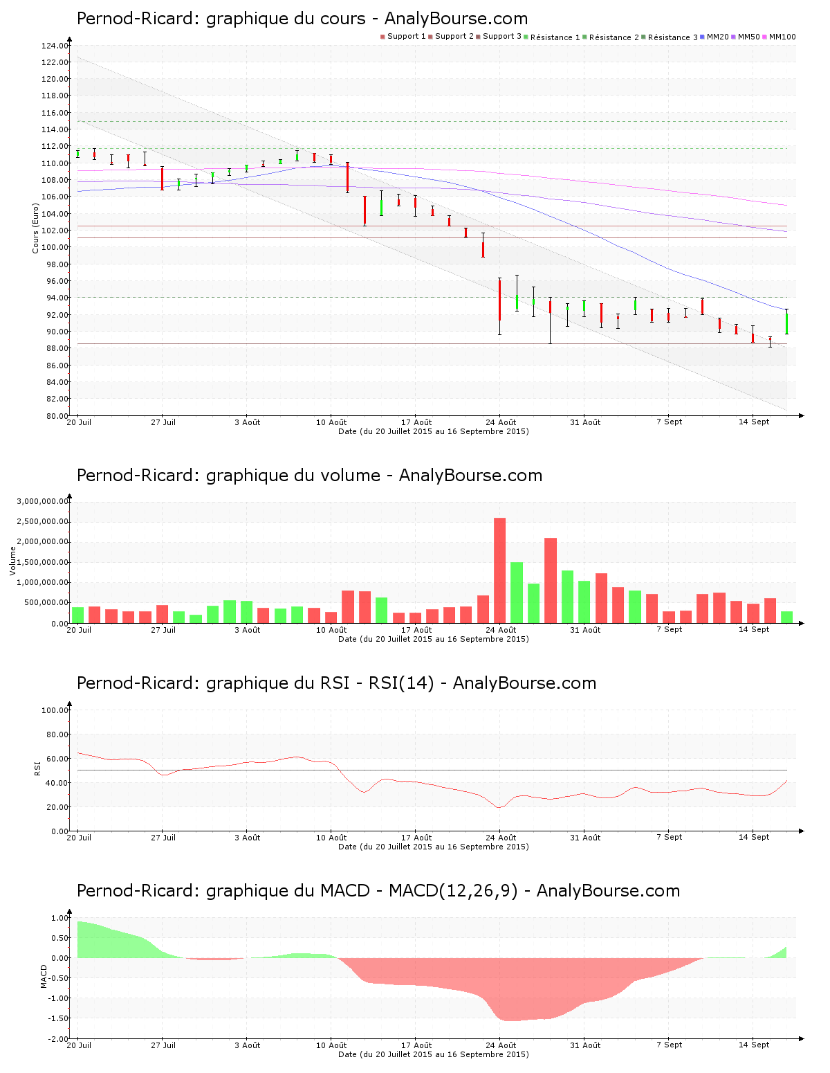 Avec un cours baissier de 0.13%, Pernod-Ricard est stable depuis une semaine. Avec un comportement baissier de 11.29%, le constat est de même très décourageant sur un mois pour le cours. Pernod-Ricard se revalorise faiblement toutefois depuis un an, avec un comportement haussier de 1.95%.