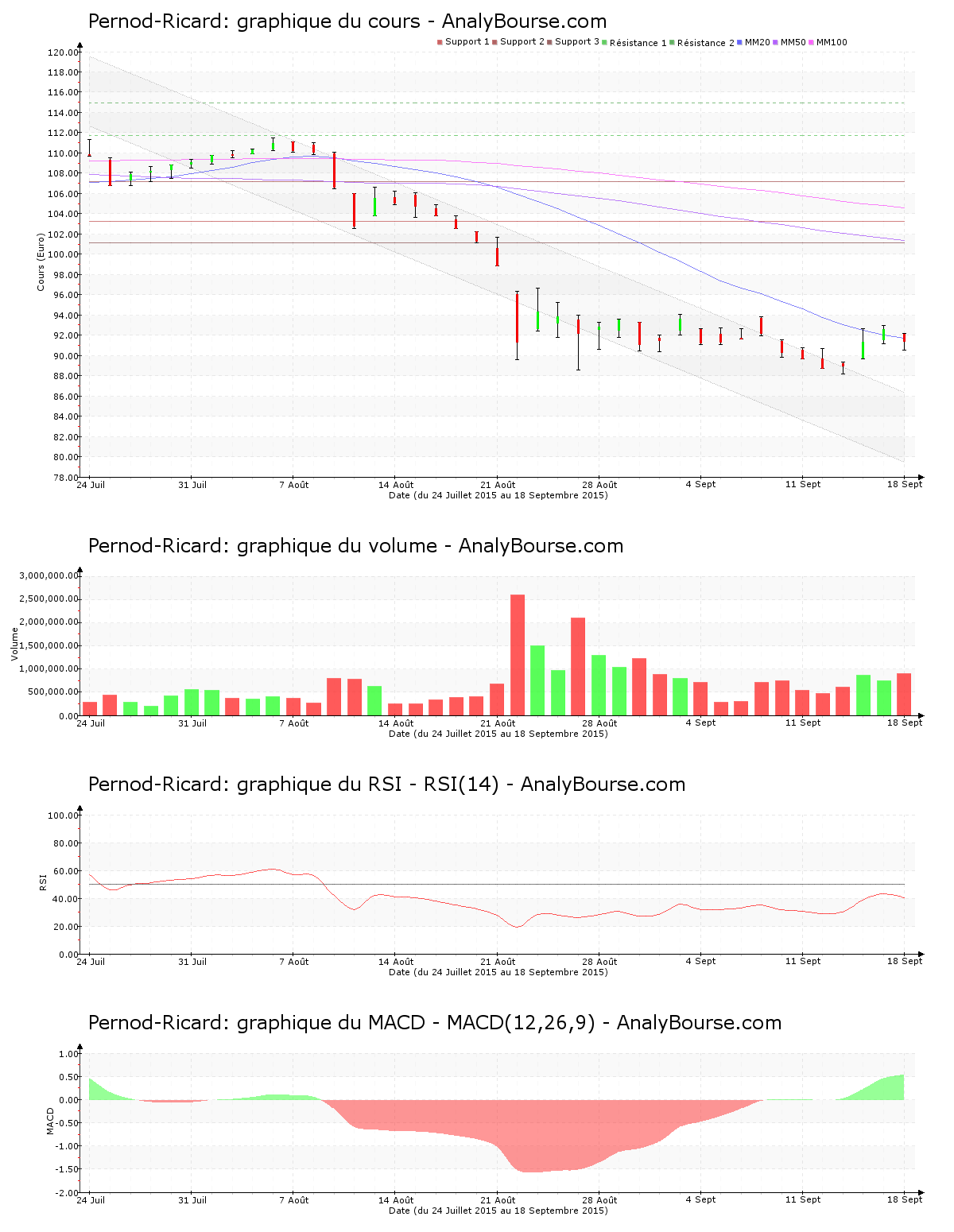 Pour les indicateurs, concernant le MACD, on constate que ce dernier est en substantielle augmentation cette semaine. Il montre dorénavant une tendance du titre en conséquente augmentation sur le moyen-court terme. Pour sa part, la moyenne mobile sur vingt jours de la valeur Pernod-Ricard se place en deçà de la moyenne mobile sur cinquante jours, et la moyenne mobile sur cinquante jours se place quant à elle en deçà de la moyenne mobile sur cent jours. A long terme, le mouvement de l’action est ainsi en baisse. Voilà à présent 55 séances de cotations que la moyenne mobile sur cinquante jours de l’action Pernod-Ricard se place en deçà de sa moyenne mobile sur cent jours. Enfin, on observe que l’indicateur RSI est plutôt stable ces derniers jours. Il se positionne donc encore dans le niveau de vente.