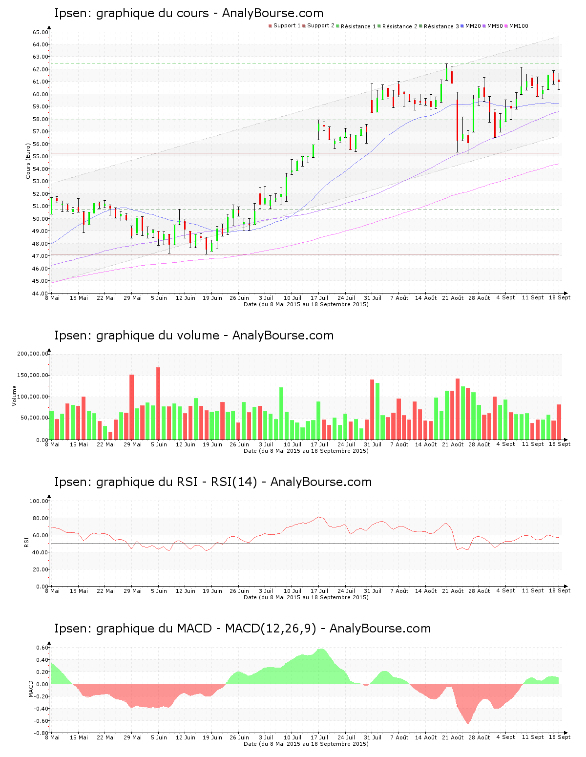 Le MACD est ces cinq dernières séances stable. Il dévoile ainsi encore une tendance du titre en grande croissance à moyen-court terme. Pour sa part, la moyenne mobile sur vingt jours de la valeur Ipsen est localisée au-delà de sa moyenne mobile sur cinquante jours, qui est quant à elle positionnée au-delà de sa moyenne mobile sur cent jours. L’action exprime ainsi un cours en hausse à long terme. Voici dorénavant 51 séances de cotations que la moyenne mobile sur vingt jours de la valeur Ipsen se place au-dessus de sa moyenne mobile sur cinquante jours. Enfin, le RSI est ces cinq derniers jours stable. Ce dernier se place donc toujours dans le niveau d’achat.