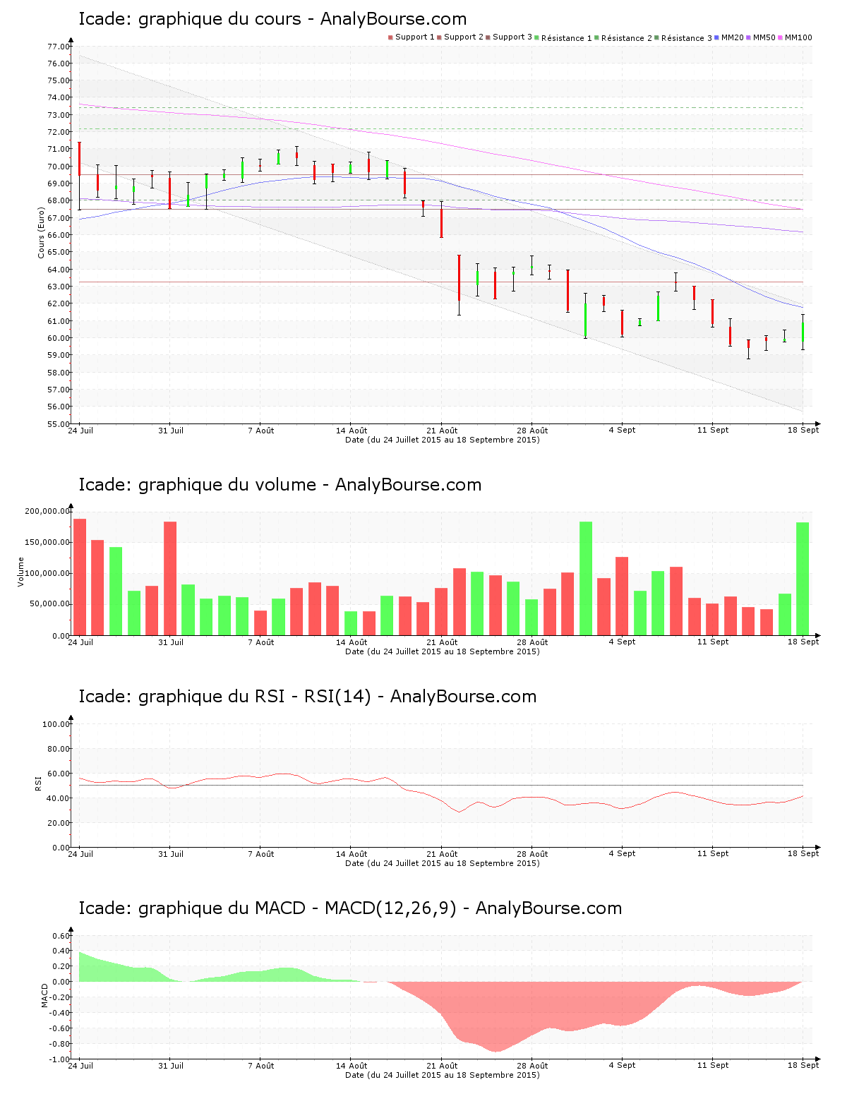En ce qui concerne les indicateurs, l’indicateur RSI est ces derniers jours assez stable. Il se trouve donc encore dans le niveau de vente. De son côté, la moyenne mobile sur vingt jours de l’action Icade se place en deçà de la moyenne mobile sur cinquante jours, qui se localise elle-même en deçà de la moyenne mobile sur cent jours. Le comportement de la valeur est par conséquent en décroissance sur la durée. Voici à présent 78 séances que la moyenne mobile sur cinquante jours de la valeur Icade se place en deçà de sa moyenne mobile sur cent jours. On remarque que ces cinq dernières séances de cotations l’indicateur MACD est en forte augmentation. C’est dorénavant une tendance du cours relativement stable qu’il montre sur le moyen terme. L’indicateur MACD a basculé en territoire positif vendredi dernier, ce qui peut esquisser une base d’une orientation en croissance sur une longue période pour Icade.