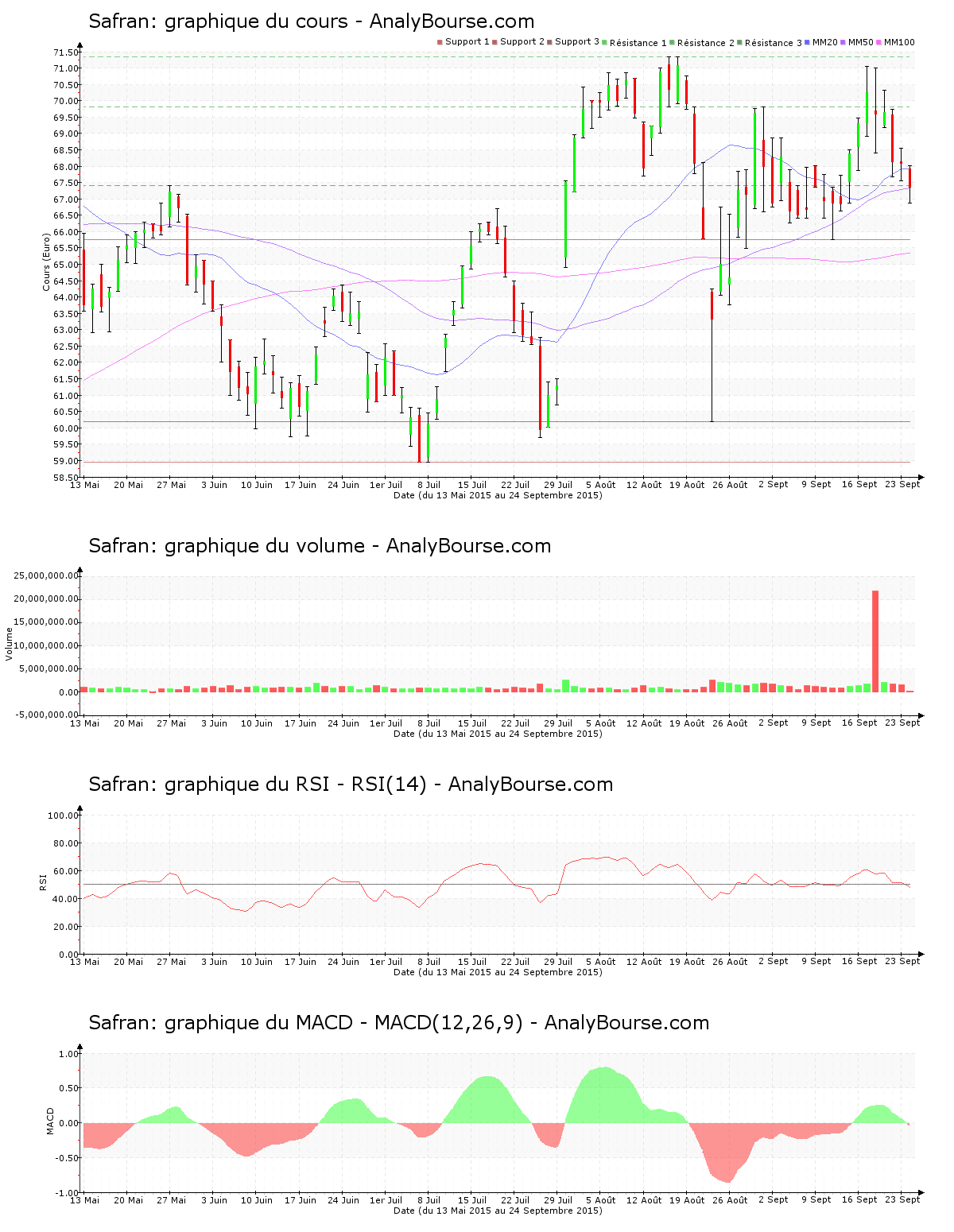 En ce qui concerne les indicateurs, l’indicateur RSI est en diminution aujourd’hui. Il est passé dans le niveau de vente, ce qui peut esquisser un engagement de tendance décroissante pour l’action Safran sur le long terme. L’indicateur MACD est en conséquente diminution ce jour. Ce jeudi, l’indicateur MACD est passé en territoire négatif, ce qui pourrait représenter un prélude d’une trajectoire en décroissance pour l’action Safran à longue échéance.
