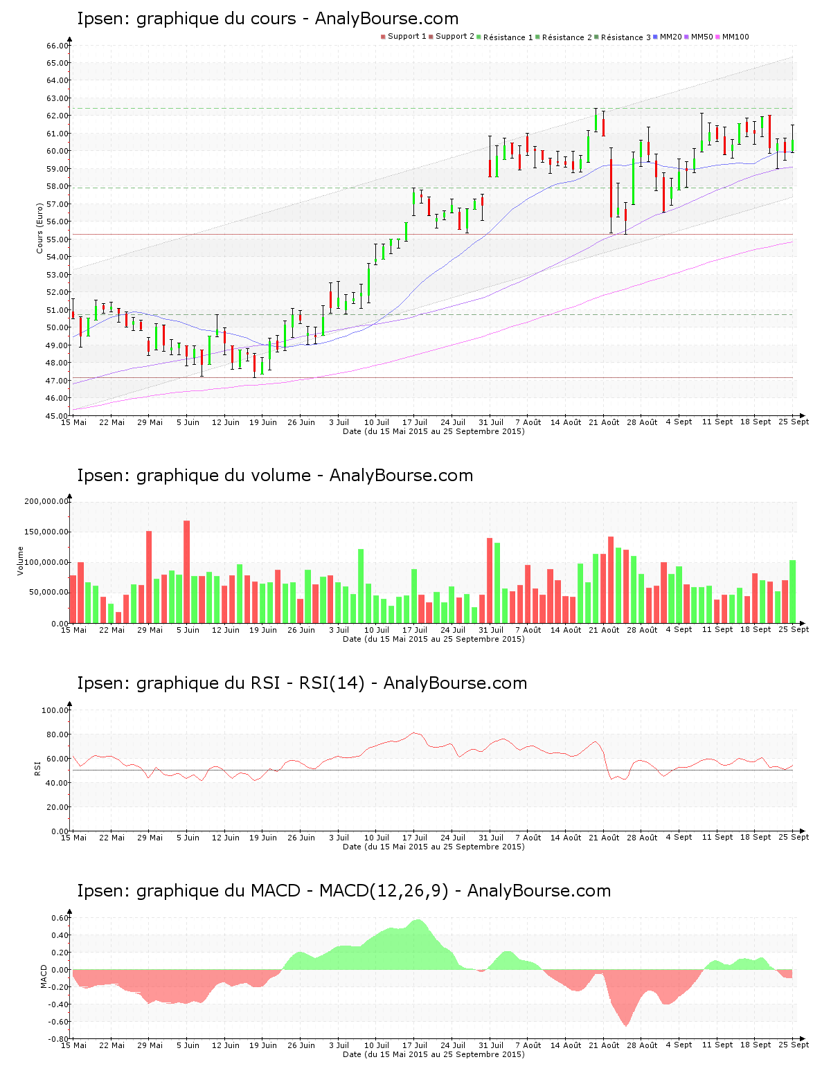 Pour les indicateurs, en ce qui concerne l’indicateur MACD, on relève que ce dernier est en forte baisse ces dernières séances. C’est à présent une tendance du titre en forte décroissance qu’il indique sur le moyen-court terme. Le MACD a basculé du côté négatif mercredi dernier, cela pourrait ébaucher un prémice de tendance décroissante sur la durée pour Ipsen. De son côté, on remarque que ces dernières séances l’indicateur RSI est assez stable. C’est par conséquent encore au niveau neutre que ce dernier se place. Enfin, l’action Ipsen possède une moyenne mobile sur 20 jours située au-delà de sa moyenne mobile sur 50 jours, qui est quant à elle positionnée au-delà de sa moyenne mobile sur 100 jours. L’action affiche ainsi un mouvement haussier à longue échéance. Depuis dorénavant 56 séances de cotations, la moyenne mobile sur 20 jours de l’action Ipsen se trouve au-delà de sa moyenne mobile sur 50 jours.
