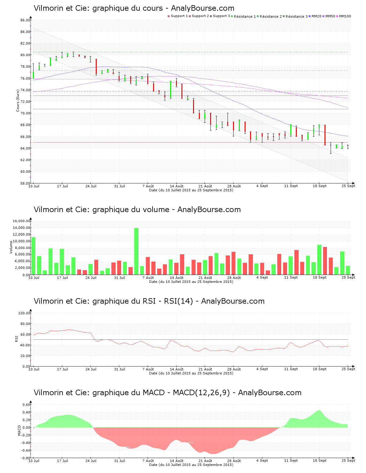 En ce qui concerne les indicateurs, la moyenne mobile sur 20 jours de l’action Vilmorin et Cie est située en deçà de sa moyenne mobile sur 50 jours, qui est quant à elle située en deçà de sa moyenne mobile sur 100 jours. Sur une longue période, la valeur montre par conséquent un mouvement baissier. Pour sa part, on constate que ces cinq derniers jours de cotations l’indicateur RSI est en régression. C’est dorénavant au niveau de vente qu’il se place. Pour terminer, le MACD est en ferme baisse ces derniers jours. C’est malgré ceci toujours une tendance du cours en solide progression qu’il suggère sur le moyen-court terme.