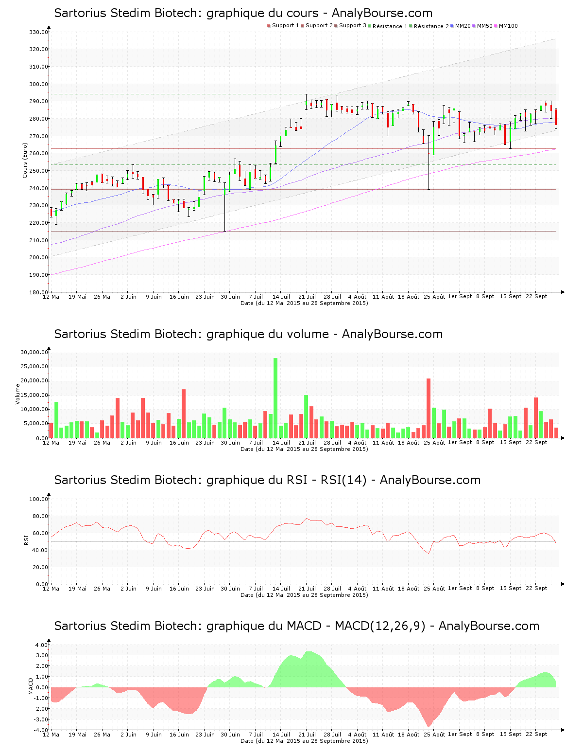 Côté indicateurs, on repère que l’indicateur MACD est en conséquente décroissance aujourd’hui. Il suggère malgré ceci toujours une trajectoire du cours en importante hausse à moyen-court terme. L’indicateur RSI est ce lundi 28 septembre en baisse. Il a basculé au niveau de vente, ce qui pourrait révèler un engagement d’une orientation en baisse pour l’action Sartorius Stedim Biotech à longue échéance.