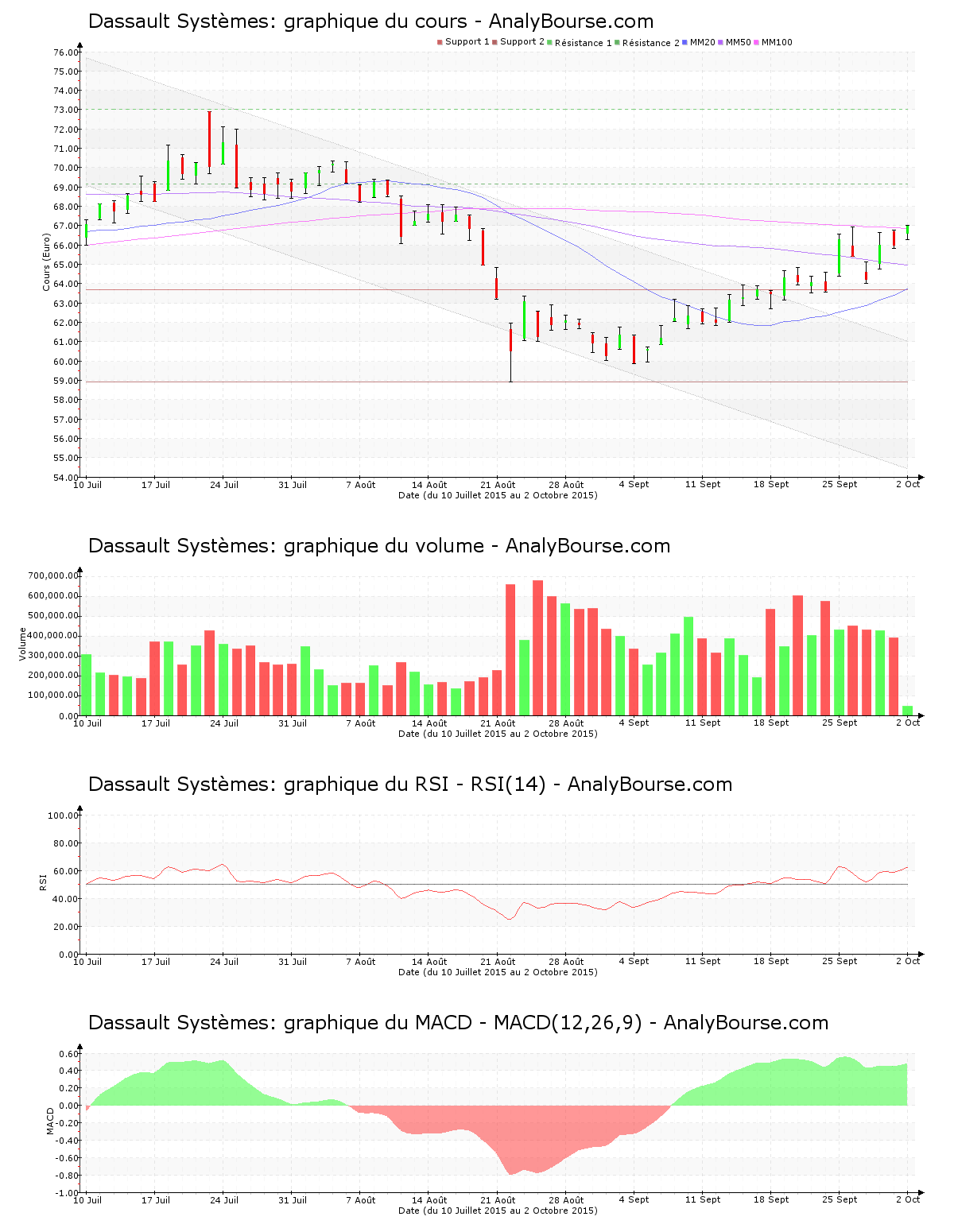 L’action Dassault Systèmes n’avait pas franchi ce seuil depuis le mercredi 19 août 2015. Avec un volume à 12:27 d’à peu près 47000 titres échangés, l’action Dassault Systèmes gonfle ce vendredi 2 octobre, avec un parcours haussier de 1.45%. L’action s’apprécie finalement de 0.960 €, commençant à 66.000 € pour parvenir à 66.960 €. Dassault Systèmes stagnait hier. La valeur reprend ainsi son mouvement croissant. Le cours évolue désormais proche de la résistance des 69.160 €.