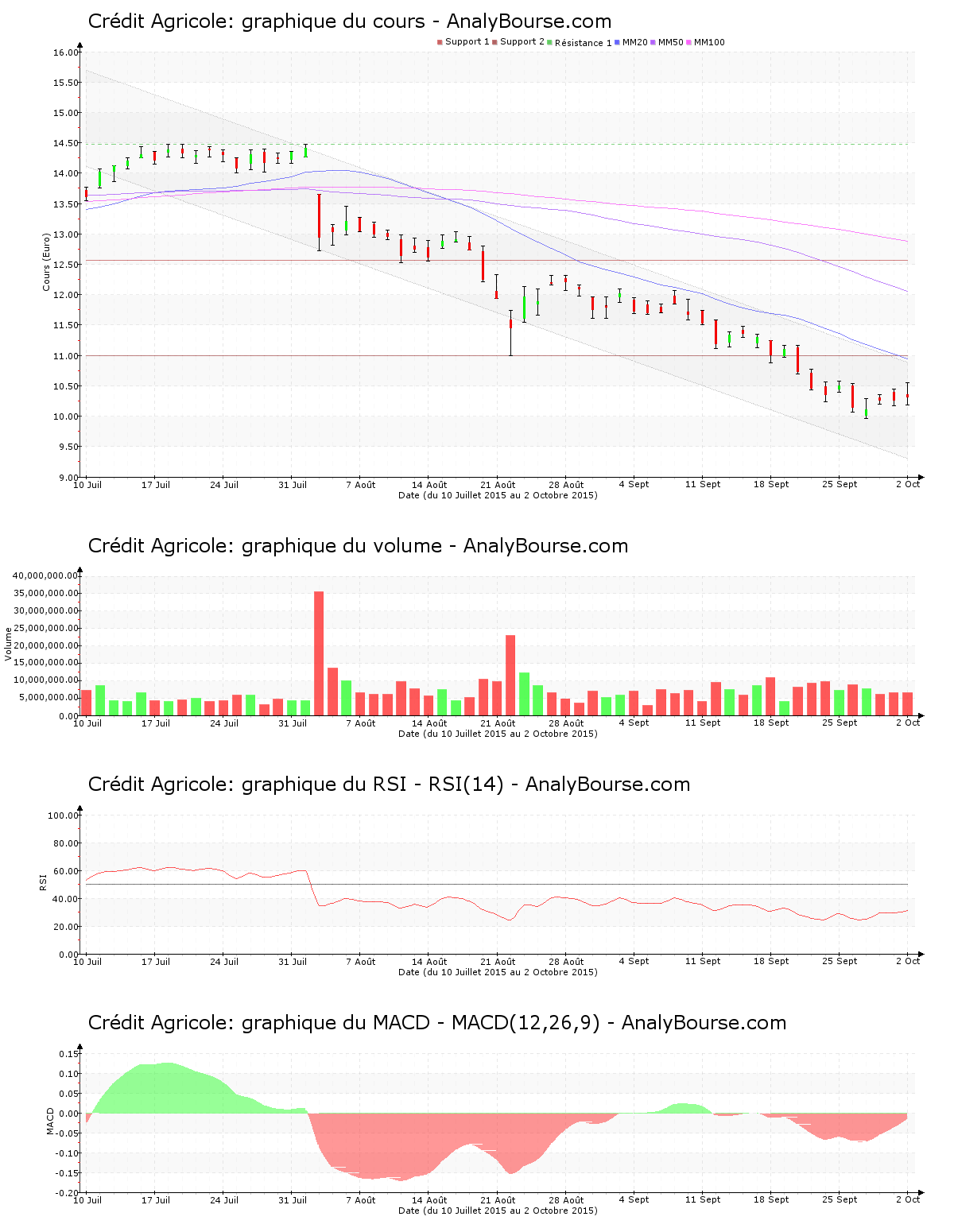En ce qui concerne les indicateurs, la moyenne mobile sur 20 jours de l’action Crédit Agricole se place en deçà de la moyenne mobile sur 50 jours, qui se positionne quant à elle en deçà de la moyenne mobile sur 100 jours. Le comportement de la valeur est donc en régression à longue échéance. Depuis désormais 34 séances de cotations, la moyenne mobile sur 20 jours de l’action Crédit Agricole se place en deçà de sa moyenne mobile sur 50 jours. De son côté, le MACD est ces dernières séances en croissance. C’est désormais une tendance du cours plutôt stable que ce dernier dévoile à moyen-court terme. Le RSI est plutôt stable ces derniers jours. Ce dernier se positionne ainsi encore dans le niveau de vente.