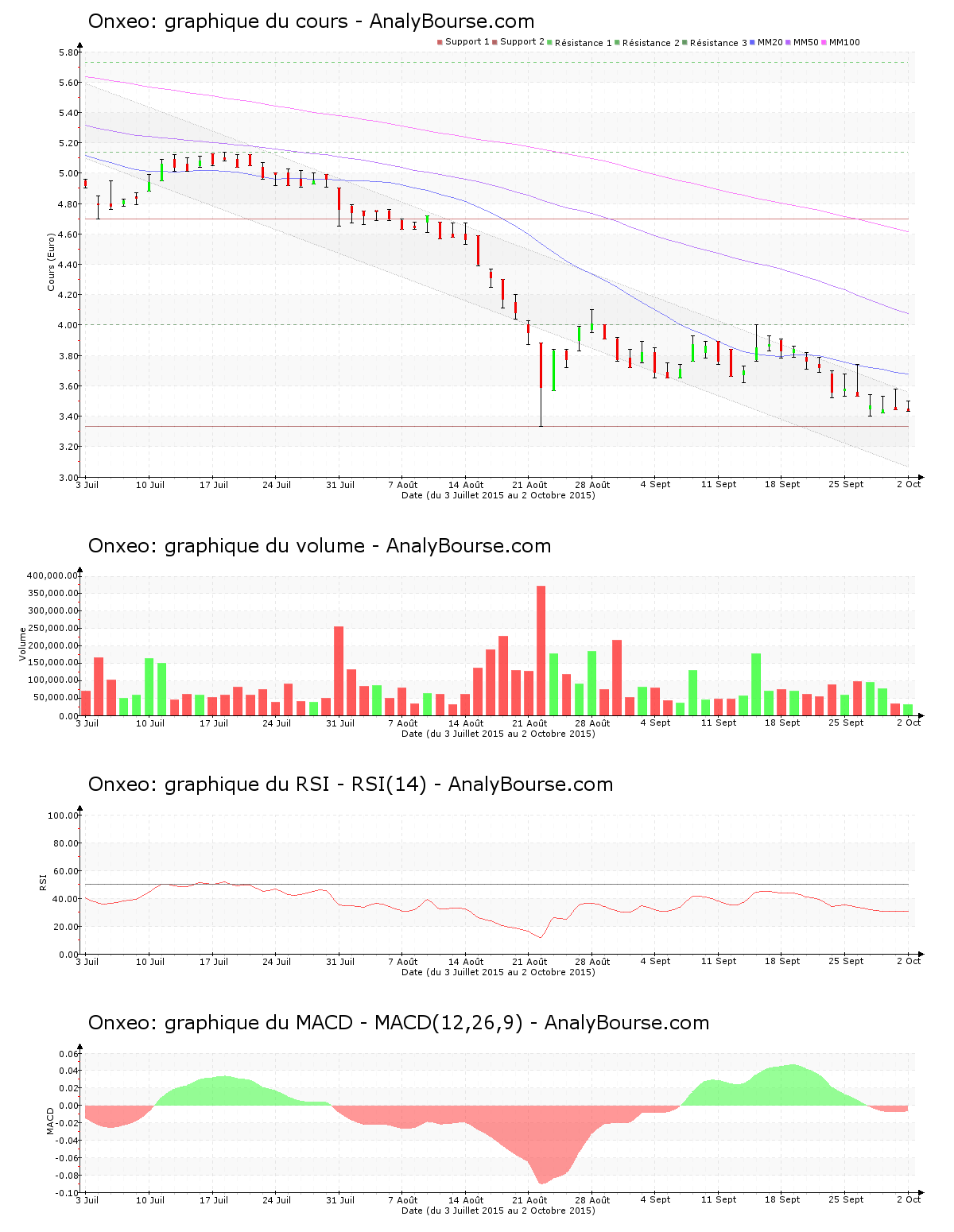 L’intention d’achat sur l’action Onxeo ces cinq dernières séances est toujours faible, illustrée par un cours décroissant de 3.91%. Elle atteint maintenant la somme de 3.440 €. Avec un mouvement baissier de 6.53%, Onxeo chutait la semaine dernière. Depuis la semaine dernière, l’action ralentit ainsi son comportement décroissant. Avec un pourcentage de 10.00% distançant le maximum du minimum de Onxeo, on relève une manifeste agitation cette semaine sur le cours. Le mouvement du titre l’entraîne maintenant à proximité du support des 3.330 €. La valeur se positionne au niveau supérieur du canal à l’intérieur duquel elle navigue ces dernières semaines.
