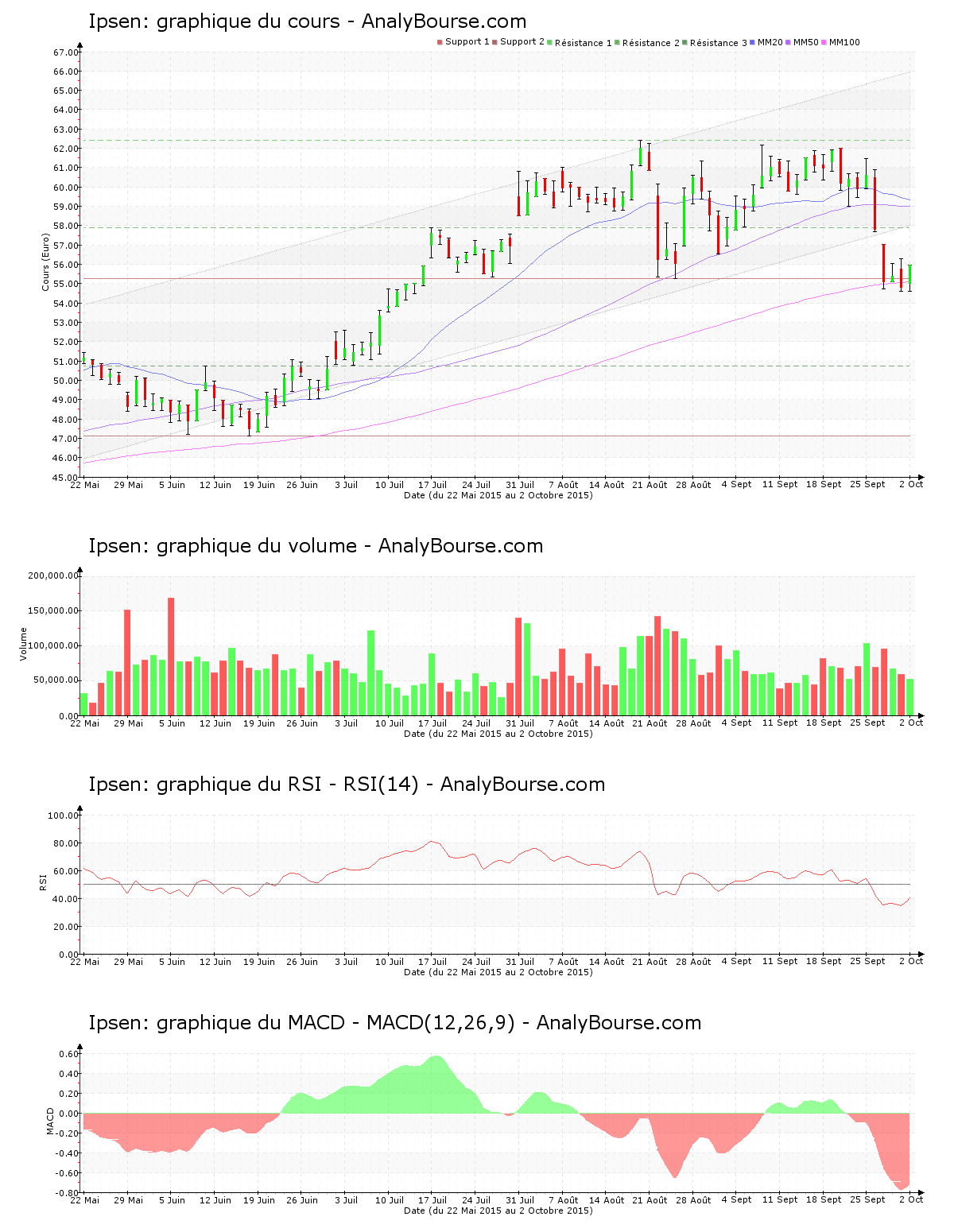 En ce qui concerne les indicateurs, la moyenne mobile sur 20 jours de la valeur Ipsen se positionne au-delà de la moyenne mobile sur 50 jours, et la moyenne mobile sur 50 jours se place elle-même au-delà de la moyenne mobile sur 100 jours. Sur une longue période, l’action révèle ainsi un comportement haussier. Depuis finalement 61 séances, la moyenne mobile sur 20 jours de l’action Ipsen se localise au-delà de sa moyenne mobile sur 50 jours. Ensuite, le MACD est ces dernières séances en grande régression. Il révèle dorénavant une trajectoire du titre en conséquente décroissance à moyen-court terme. On remarque que l’indicateur RSI est en décroissance cette semaine. Ce dernier se localise désormais dans le niveau de vente.