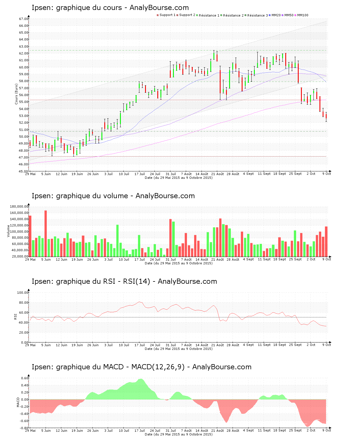 Ces informations constituent une analyse technique de la valeur Ipsen au dimanche 11 octobre 2015. Cette analyse peut être invalidée par des éléments plus récents, et ne constitue en aucune manière une incitation d’achat ou de vente sur les marchés financiers. Le lecteur reste libre et responsable de l’interprétation et de l’usage faits de ces informations.