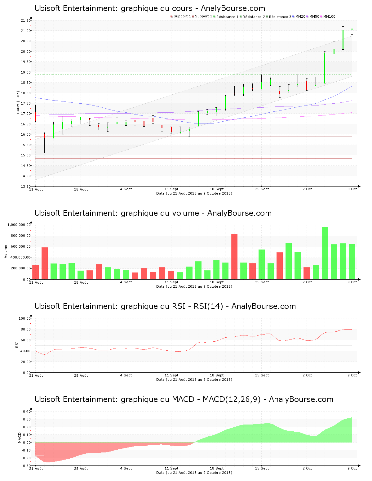 Ces informations constituent une analyse technique de la valeur Ubisoft Entertainment au dimanche 11 octobre 2015. Cette analyse peut être invalidée par des éléments plus récents, et ne constitue en aucune manière une incitation d’achat ou de vente sur les marchés financiers. Le lecteur reste libre et responsable de l’interprétation et de l’usage faits de ces informations.